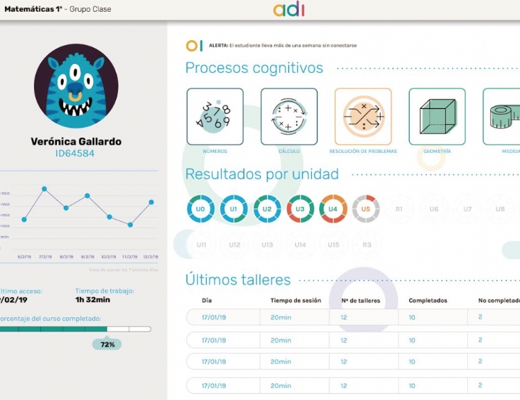 ADIMAT ayuda al profesor y al alumno, de forma muy visual, a trabajar con sesiones adaptadas a las necesidades y ritmos de aprendizaje de la clase y de cada alumno. La solución digital incrementa su motivación, con una interfaz atractiva y adaptada a la edad del alumno y con feedback, con mensajes de refuerzo positivo durante la ejecución de los ejercicios y actividades para saber cómo es su aprendizaje. Además, utiliza elementos de gamificación para mantener el interés e incentivar su progreso Adimat permite al docente decidir en todo momento cómo usar la herramienta, adaptándola a su propia metodología y para cada grupo y alumnos concretos, de manera totalmente flexible.