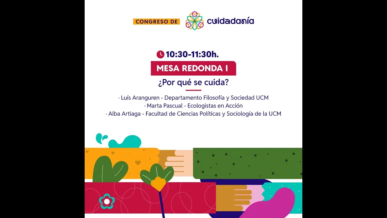 El programa del congreso ha incluido dos mesas redondas principales. La primera, titulada ‘¿Por qué se cuida?’, ha contado con la participación de Luis Aranguren,  del Departamento de Filosofía y Sociedad de la Universidad Complutense; Marta Pascual, de Ecologistas en Acción; y Alba Artiaga, de la Facultad de Ciencias Políticas y Sociología de la misma universidad.