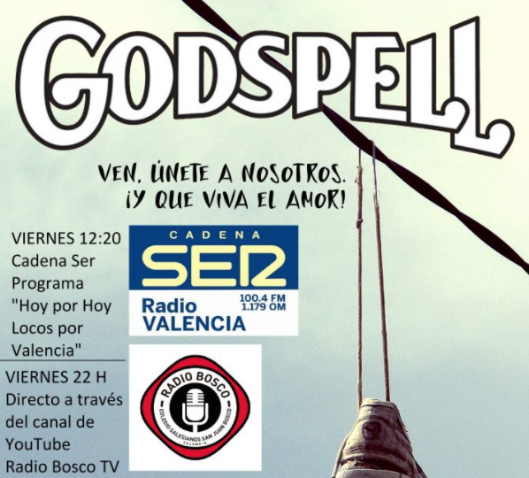 El Musical Solidario Godspell será el protagonista el viernes 23 de febrero, de 12:20 a 14 horas, del programa “Hoy por Hoy. Locos por Valencia”, que se retransmite a través de Radio Valencia 100.4 FM, Radio Valencia 1179 OM y también a través de la web www.radiovalencia.es y la app Cadena ser. Además de la retransmisión por la radio, el programa se emitirá en streaming en esta misma página web.