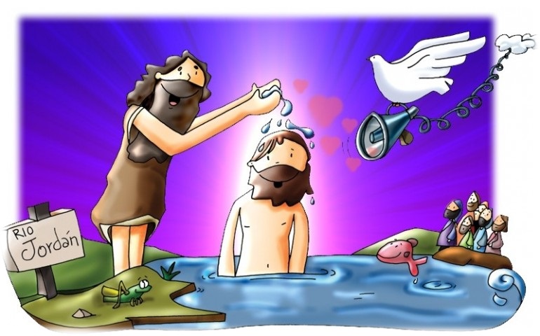 Jesús fue al Jordán para ser bautizado por su primo Juan. Jesús sabía que era profeta y le respetaba y era amigo suyo. Al verlo, Juan dijo: -¡Mirad, el hombre del que os hablé! y después dijo a Jesús: -Eres tú el que me tienes que bautizar, ¿y vienes para que yo te bautice? Pero Jesús le mandó que lo hiciera. El Espíritu de Dios entró en Jesús, y se oyó la voz del Padre que dijo «Este es mi hijo, el amado, mi predilecto». Todos estaban pendientes de Jesús, después de oír la voz de Dios. Y Jesús, se fue al desierto a orar.