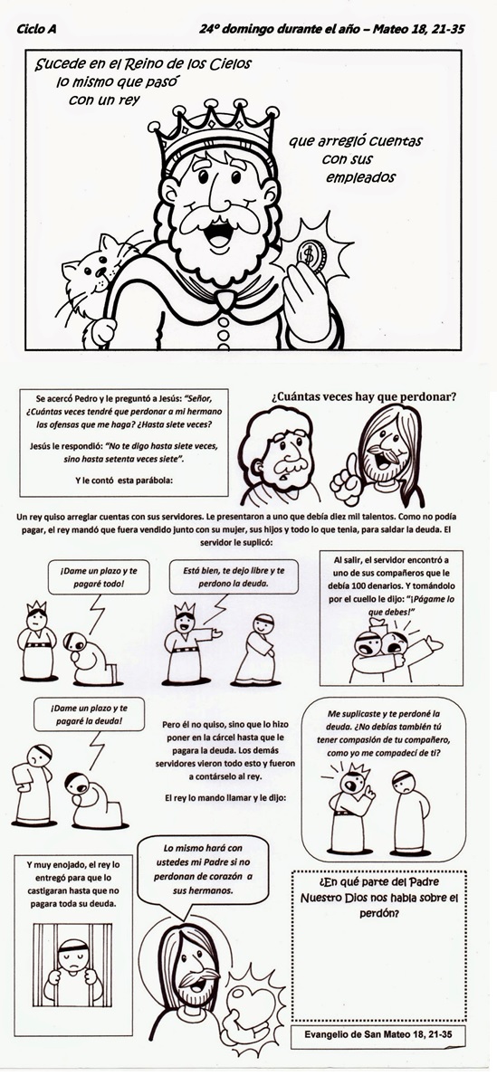 JESÚS: Hablando de esto, se parece el reino de los cielos a un rey que quiso ajustar cuentas con sus criados. Al empezar, le presentaron uno que debía diez mil talentos. Como no tenía con qué pagar, el señor mandó que lo vendieran a él con su mujer y sus hijos y todas sus posesiones, y que pagara así.