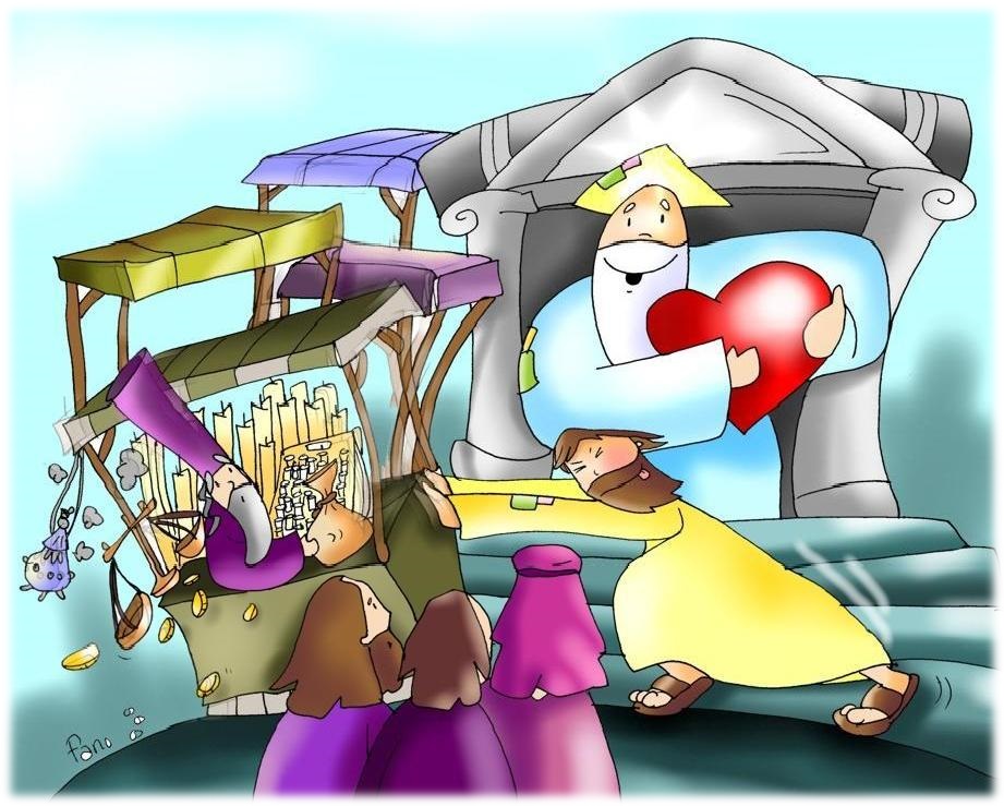 NARRADOR: Escuchad. Se acercaba la Pascua de los judíos y Jesús subió a Jerusalén. Y encontró en el templo a los vendedores de bueyes, ovejas y palomas, y a los cambistas sentados; y, haciendo un azote de cordeles, los echó a todos del templo, ovejas y bueyes.