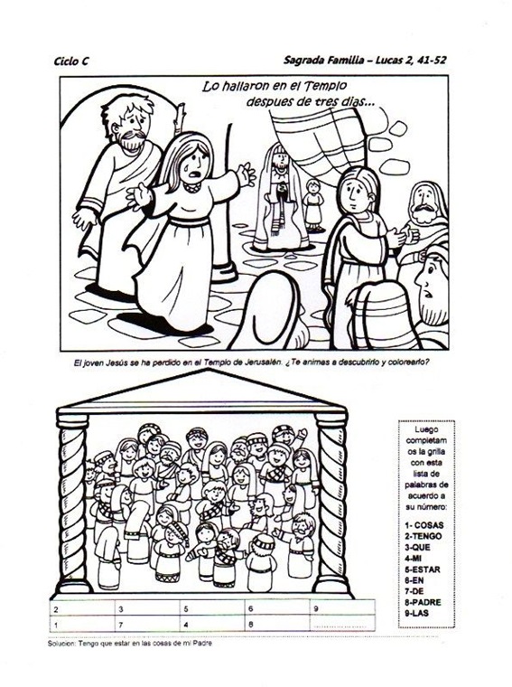 Narrador: Los padres de Jesús solían ir cada año a Jerusalén por las fiestas de Pascua. Cuando Jesús cumplió doce años, subieron a la fiesta según la costumbre y, cuando terminó, se volvieron; pero el niño Jesús se quedó en Jerusalén, sin que lo supieran sus padres. Éstos, creyendo que estaba en la caravana, hicieron una jornada.