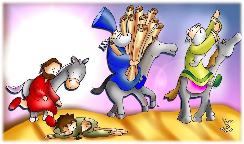 El evangelista Lucas ha construido un relato muy bonito para darnos a conocer la importancia que da Jesús al comportamiento que tenemos con el prójimo (todas las personas que necesitan de nuestra ayuda). Un hombre fue asaltado por el camino: unos bandidos le apalearon, le robaron y le dejaron medio muerto. Luego se marcharon. Por allí pasaron personas que eran consideradas buenas y lo dejaron moribundo. Más tarde pasó un samaritano (los samaritanos son despreciados por los judíos porque les consideran inferiores) que tuvo compasión del hombre herido y acercándose a él, le curó las heridas, le dio agua, le montó sobre su caballo y le llevó a una posada, para que le cuidaran hasta que se repusiera del todo. Pagó al posadero y se marchó. Con esta historia Jesús nos enseña a sus amigos el modo de portarnos con los demás.