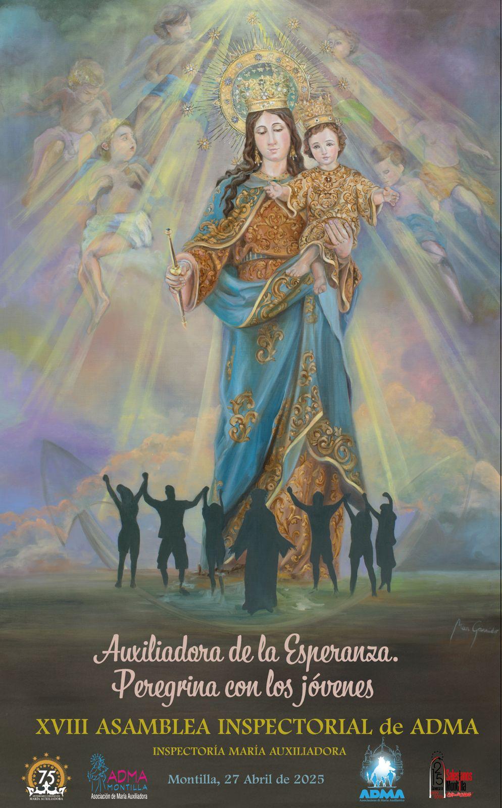 Un año más nos vuelve a convocar nuestra Madre Auxiliadora, nos vuelve a unir, como lo ha hecho siempre a lo largo de todos estos años. ELLA nos sostiene y nos anima a celebrar la XVIII Asamblea Inspectorial de ADMA, bajo el lema “Auxiliadora de la Esperanza. Peregrina con los jóvenes”, en un año que celebramos el 75 aniversario de la coronación canónica de María Auxiliadora de Montilla.