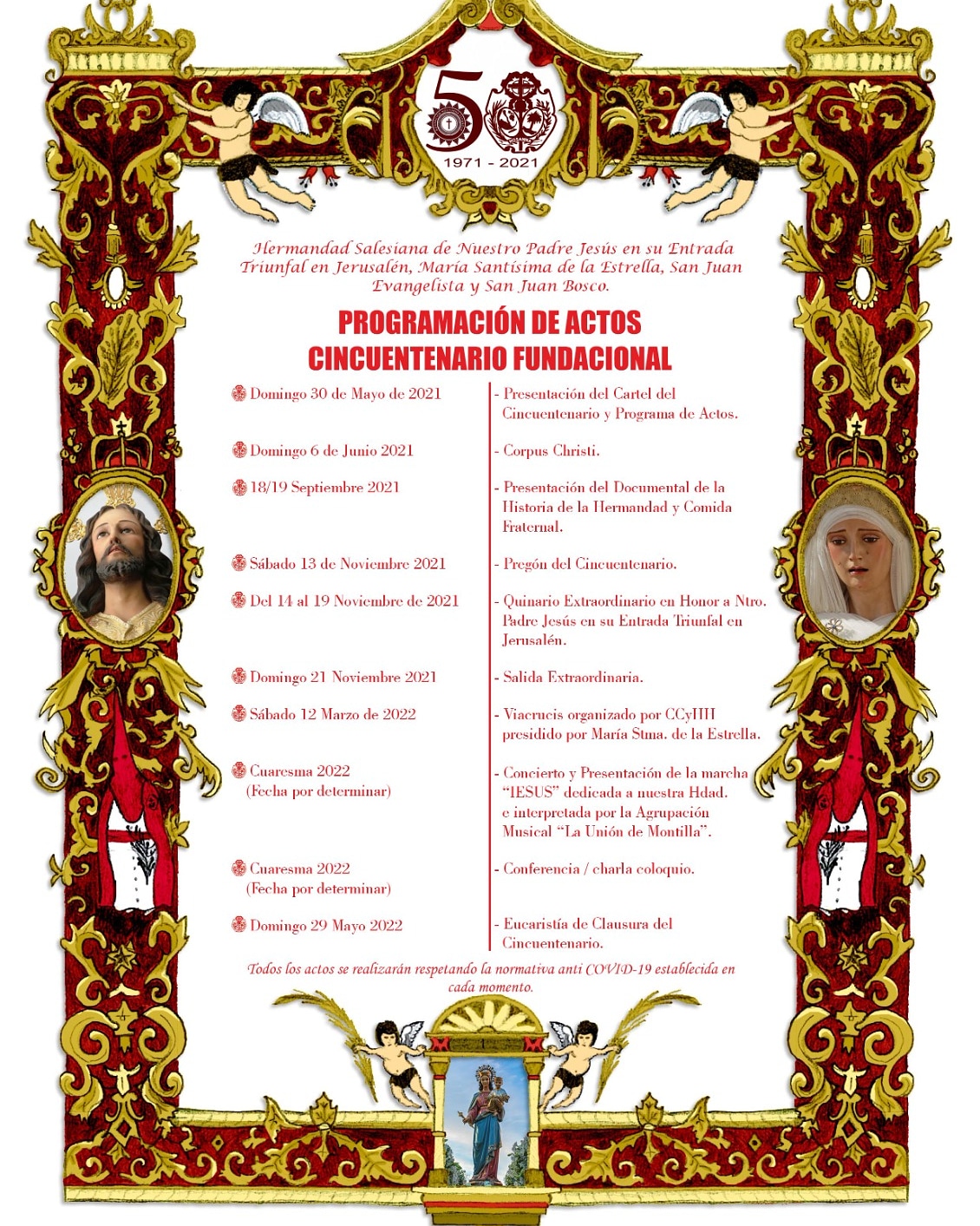 La Salesiana Hermandad de «La Borriquita» de Palma del Río se encuentra inmersa desde hoy, Domingo de la solemnidad de la Santísima Trinidad, en los actos conmemorativos del Cincuentenario fundacional de la Cofradía, un hecho que tuvo lugar el 1 de mayo de 1971 impulsado por la Adoración Nocturna.