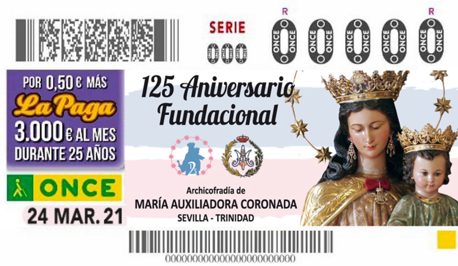El próximo 24 de marzo, la ONCE dedicará el cupón del sorteo de ese día a María Auxiliadora Coronada de la Casa de la Trinidad, en conmemoración por el 125 aniversario fundacional de la Asociación de María Auxiliadora en la presencia salesiana.