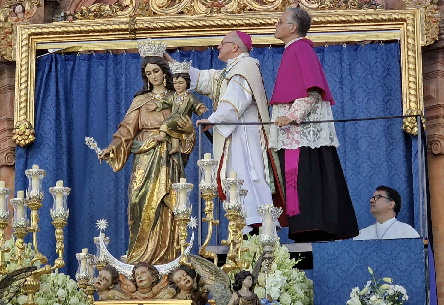Nuestra plaza de España, con la iglesia barroca y la torre blanca y azulejada como dosel sublime, se convirtió en el epicentro de un acontecimiento único. Miles de fieles, provenientes de todos los rincones de Andalucía y más allá, se congregaron para presenciar el momento cumbre de la ceremonia. Todos compartían el ver cumplido ese sueño largamente anhelado, un mismo sentimiento: la alegría de ver a su Madre celestial ser coronada como Reina de cielos y tierra.