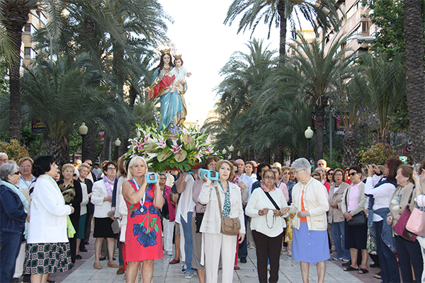 Más de 400 personas de los ambientes salesianos de Alicante, recorrieron las calles circuncidantes a la presencia salesiana del centro de la ciudad acompañando a la Virgen Auxiliadora.