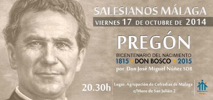 El próximo viernes 17 de octubre, a las 20:30, tendrá lugar el pregón del bicentenario del nacimiento de Don Bosco. El acto tendrá lugar en la agrupación de cofradías de Málaga, situada en C/ Muro de San Julián, 2.