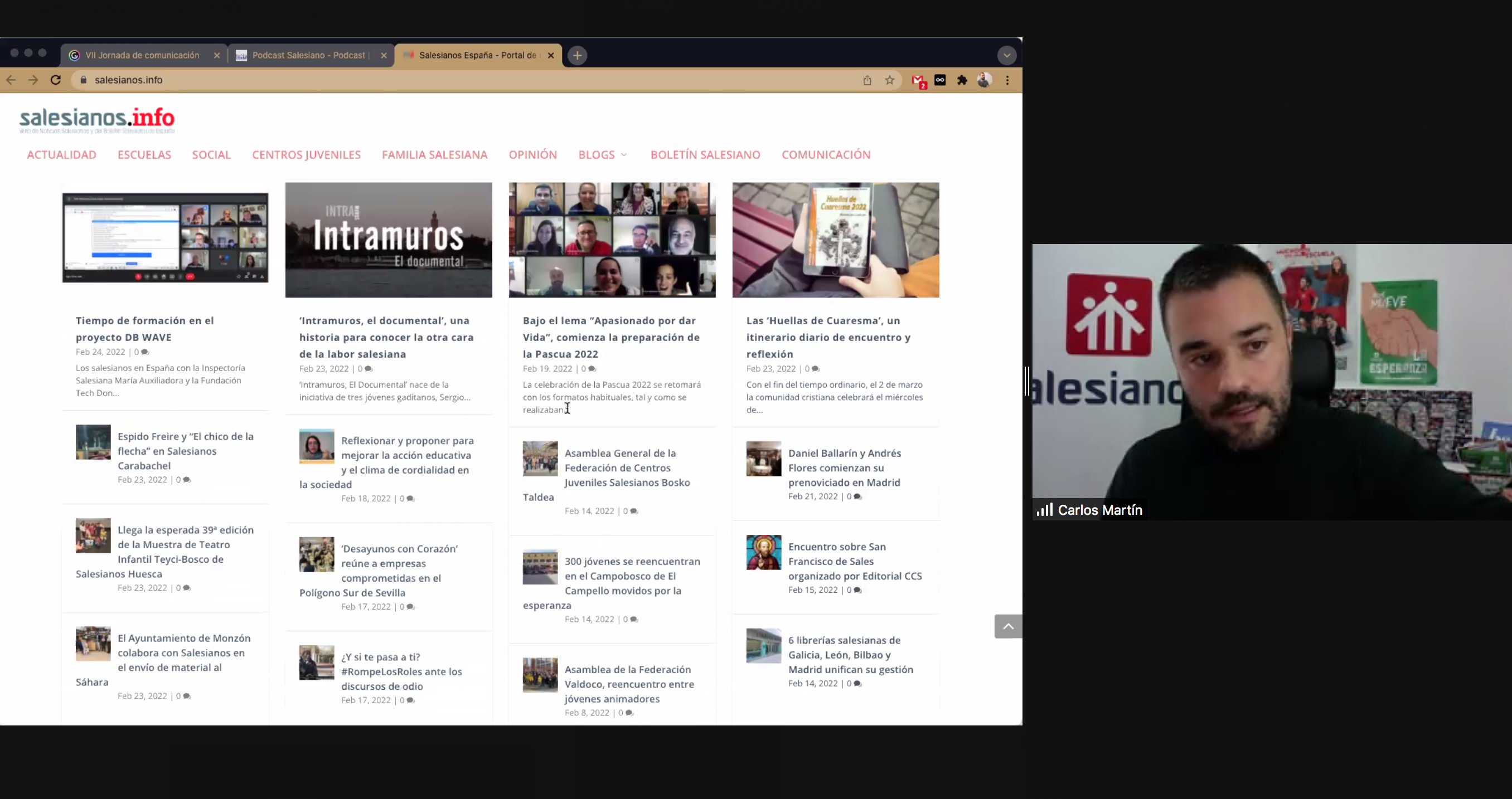 La Delegació Nacional de Comunicació Social va presentar el 24 de febrer la 8a Jornada Salesiana de Comunicació que va tenir lloc en format online de 11:00 a 13:30 i de 16:00 a 17:30, sota el títol “Dimensió Pastoral de la Comunicació”. Més de 160 responsables de comunicació, juntament amb directors i coordinadors de pastoral, entre altres destinataris, van participar en aquesta edició que va ser guiada pel delegat nacional de comunicació Fco. Javier Valiente i el delegat inspectorial de SMX, Carlos Martín.
