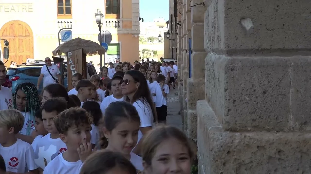 Por la mañana, unos 500 alumnos de Calós hicieron un pasacalles por el centro antiguo de Ciutadella, con paradas en el Ayuntamiento y en la Catedral que pusieron la nota de color a este aniversario.