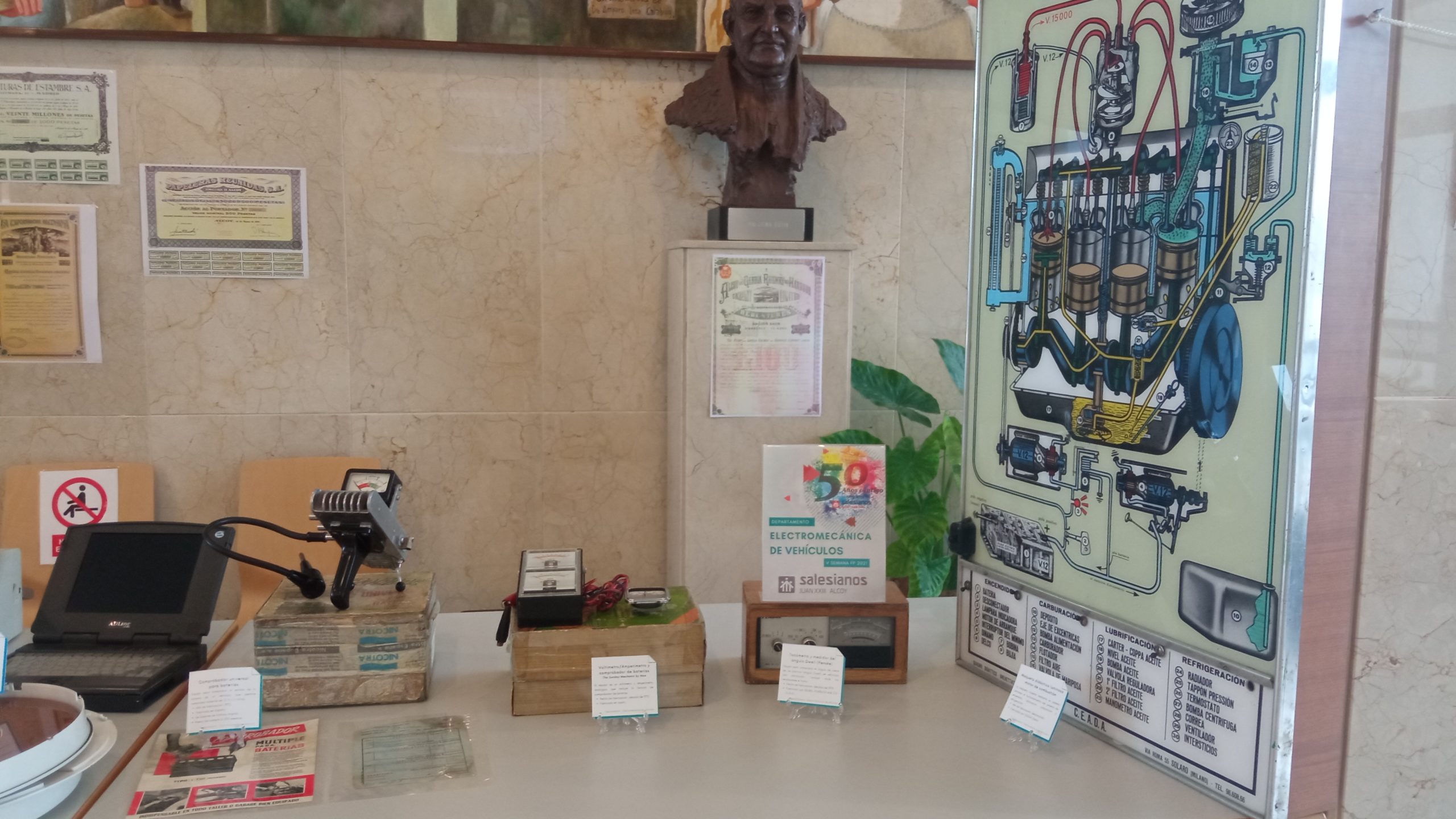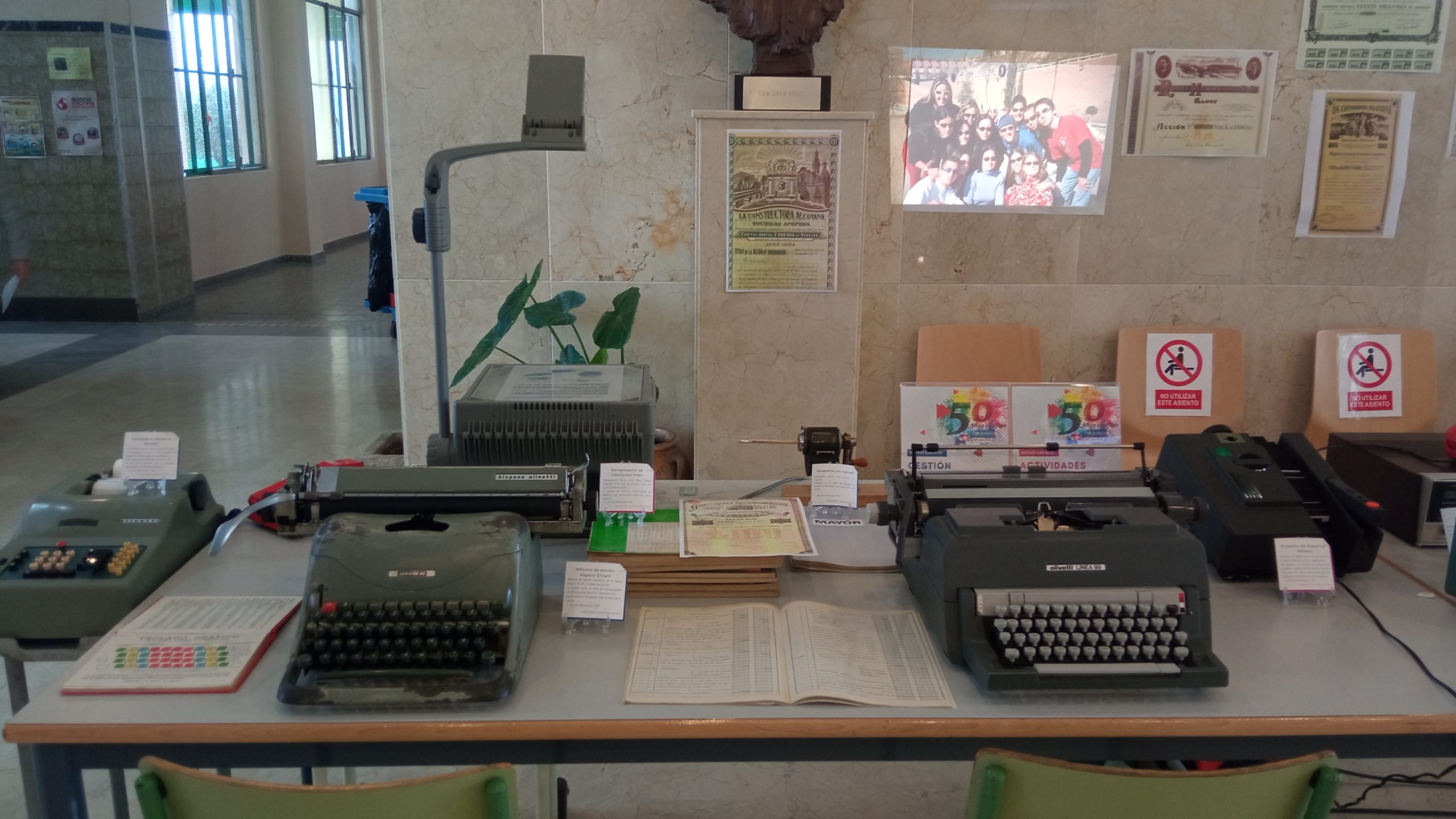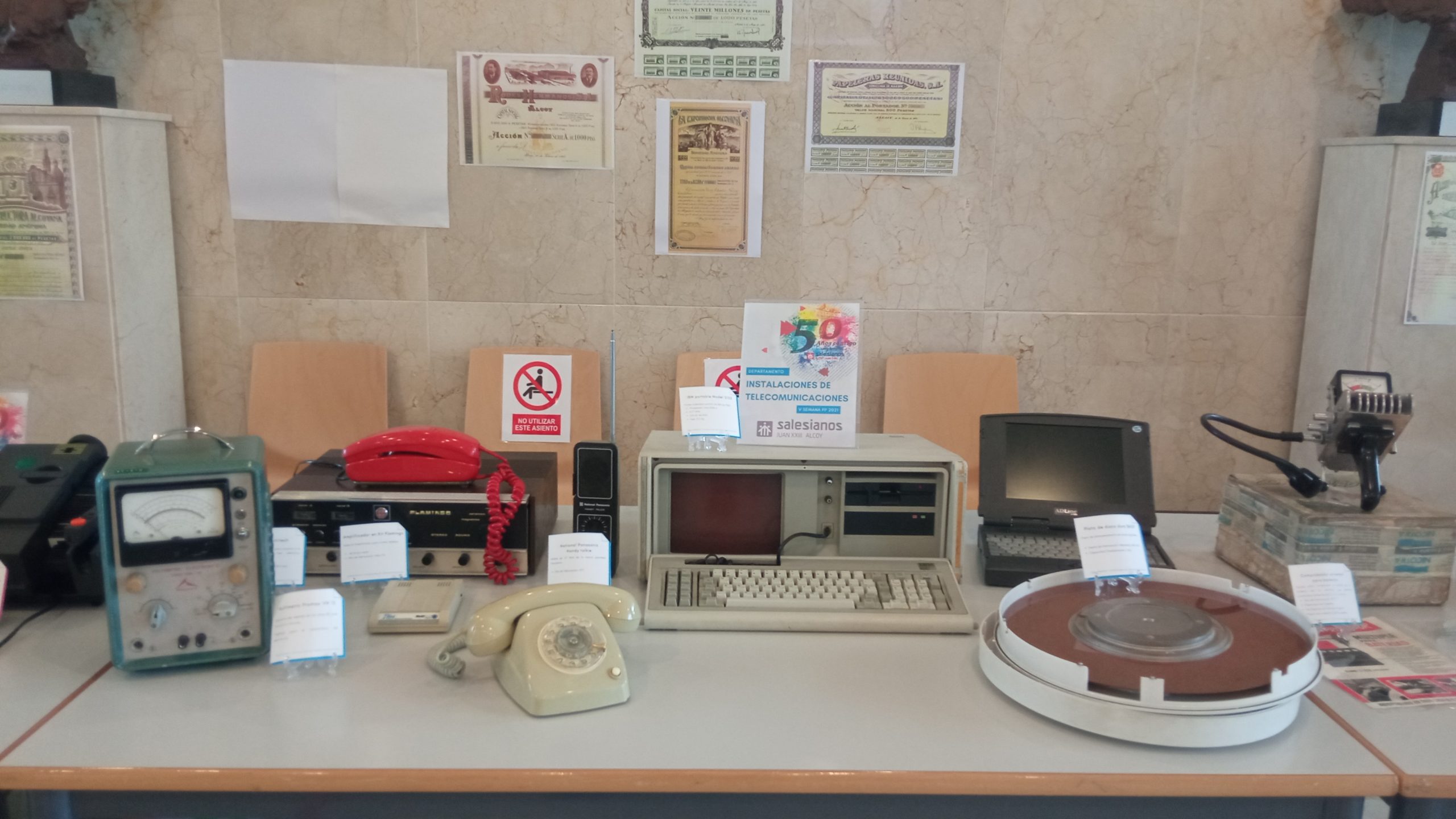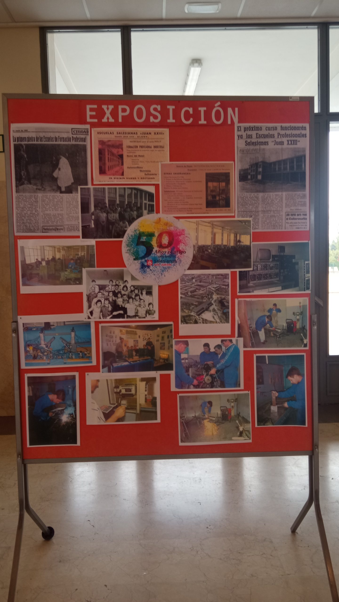 La casa salesiana Juan XXIII de Alcoy se encuentra inmersa en las celebraciones de su 50 aniversario. La pandemia ha impedido realizar actos de pública concurrencia pero el aniversario sigue presente en cada acto que realizan los miembros de la comunidad educativa. En la recepción del colegio se encuentra una exposición titulada “50 años de FP en Salesianos Juan XXIII de Alcoy” donde se pueden encontrar herramientas, equipos y maquinaria utilizados en los inicios de nuestra escuela profesional para la impartición de las clases. Algunas formaban parte de los diferentes departamentos y otras han sido aportadas para la ocasión por algunos de los profesores.