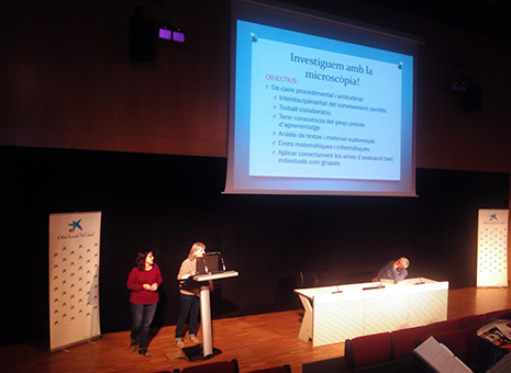 Las docentes presentaron un proyecto transversal llamado "Investiga con la microscopía ‘, un conjunto de actividades que se desarrollan a lo largo de los dos cursos de Bachillerato y que aglutinan conceptos y competencias de diferentes disciplinas como la biología y la física.