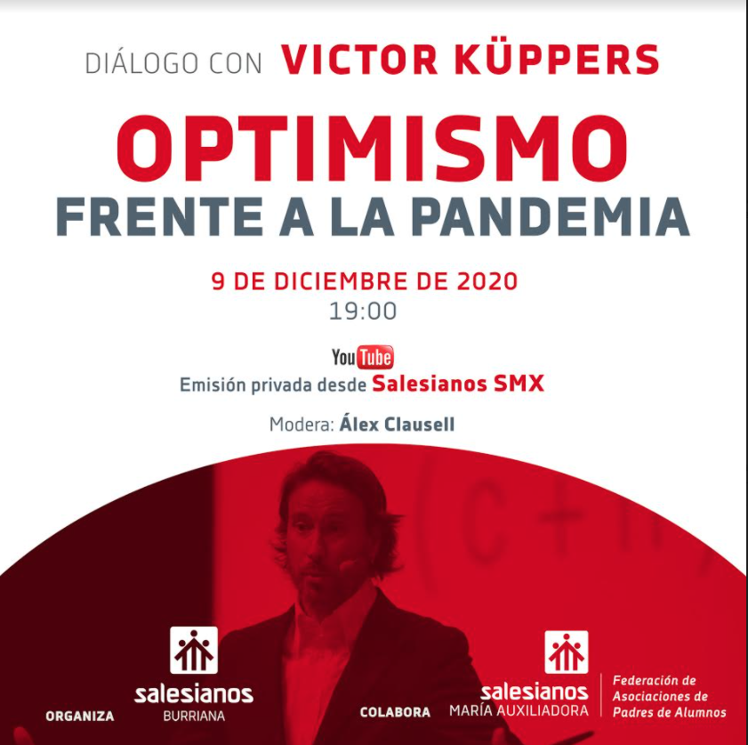 Las Escuelas Salesianas ofrecerán el próximo día 9 de diciembre un Diálogo con el formador Víctor Küppers titulado ‘Optimismo frente a la pandemia’. El encuentro, que será virtual y privado, va dirigido a todas las familias, educadores y personal de administración y servicios de la inspectoría y estará organizado por el Colegio Salesiano de Burriana con la colaboración de la Federación de Asociaciones de Madres y Padres Salesianos (FAPASI). El objetivo de las conferencias de Küppers es que actúen de revulsivo y ayuden a los participantes a reflexionar para que logren potenciar su motivación y que trabajen y vivan con más alegría, ilusión y optimismo.