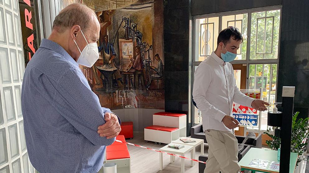 El estudiante ha cedido el dispensador a Salesianos Sarrià y el centro lo ha instalado en la portería durante los días de matriculaciones para garantizar la seguridad de las personas que han realizado varios trámites administrativos.