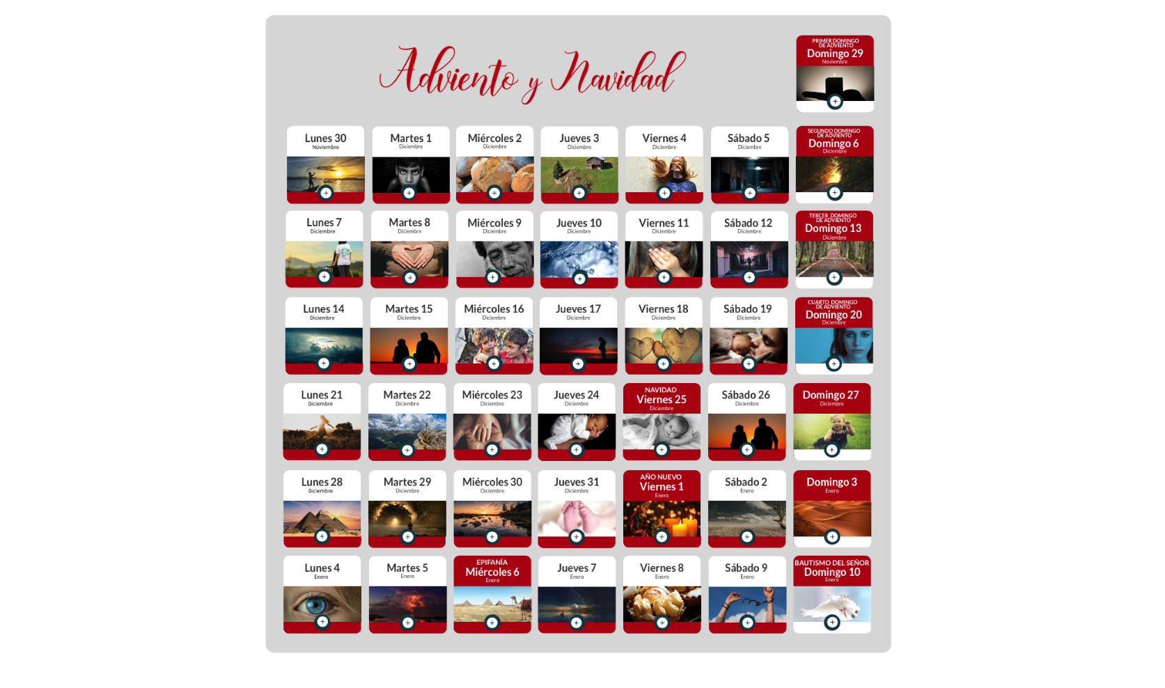 Cada día del calendario incluye el Evangelio del día y un comentario sobre el mismo a cargo del salesiano José J. Gómez. También se puede acceder a sugerencias para las homilías de estos días, tanto para la Misa ordinaria como para la Misa con niños. Otro recurso es el de ‘Comunidades en oración’, confeccionado para profundizar en la reflexión durante la semana. La propuesta diaria se completa con una frase destacada, un vídeo o una canción con valores y materiales para las celebraciones en los colegios.