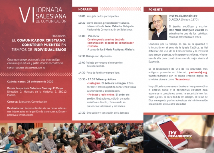 La Delegación Nacional de Comunicación Social presenta la 6ª Jornada Salesiana de Comunicación que tendrá lugar el próximo 25 de febrero, de 10:00 a 17:30, en Madrid, bajo el título “El comunicador cristiano: construir puentes en tiempos de individualismos”.