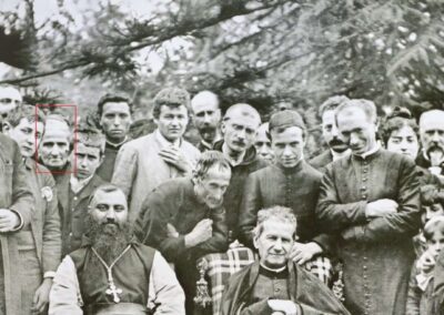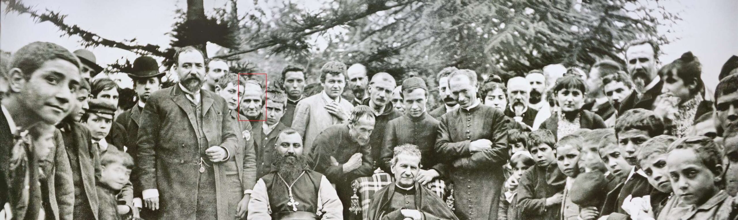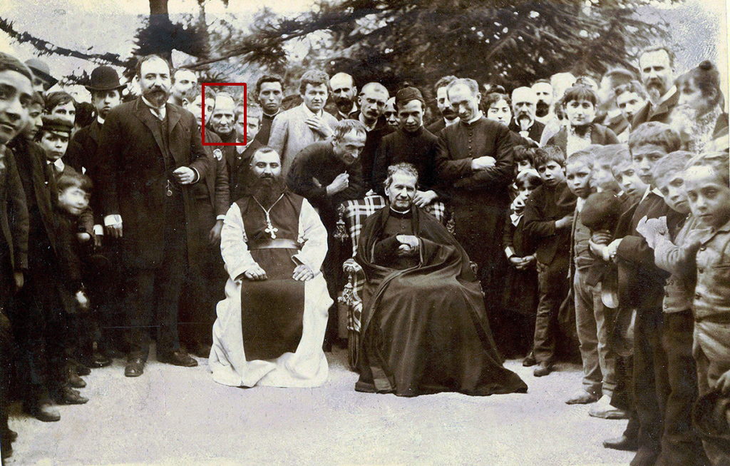 En la famosa fotografía de Don Bosco en Martí Codolar, acompañado a un lado de doña Dorotea