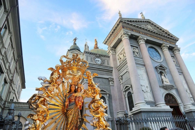 El 24 de mayo en Valdocco no puede ser un día como cualquier otro. Desde la mañana hasta la tarde el patio y la Basílica de María Auxiliadora estuvieron llenos de peregrinos y fieles que llegaron de todas partes del mundo, desde simples Turines hasta turistas lque llegaron desde muy lejos. Es que el 24 de mayo se ha vuelto a descubrir el vínculo con la Virgen de Don Bosco: la Auxiliadora.
