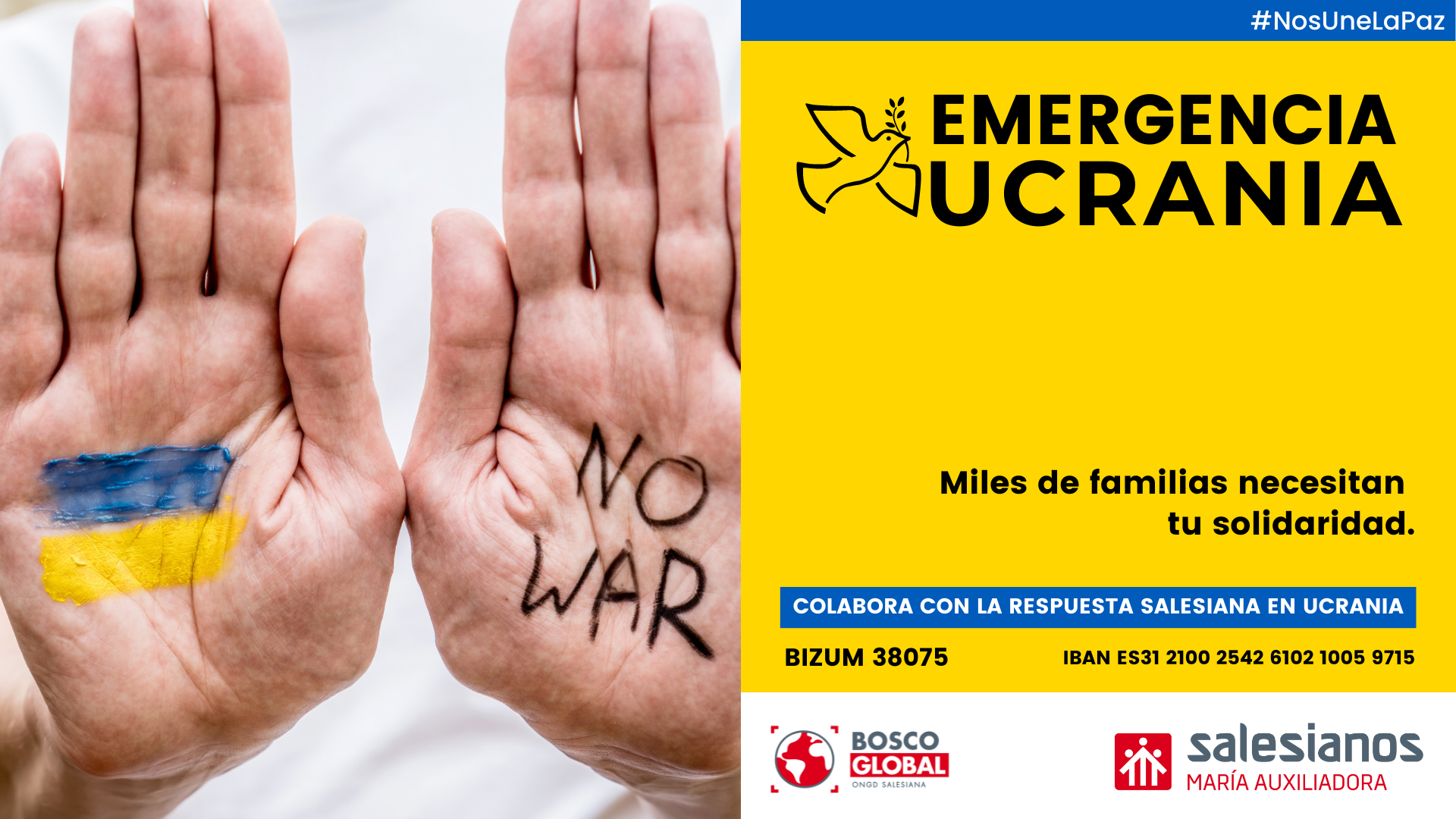 «Nuestra Inspectoría Salesiana María Auxiliadora ante la situación de guerra en Ucrania nos unimos al sentir del Rector Mayor expresado en su última carta: “Sé que todos sentimos dolor en el corazón ante lo que el pueblo ucraniano está sufriendo. También nosotros como familia salesiana de Don Bosco, y yo en nombre de todos, gritamos el ¡No a la guerra!, imploramos el cese de esta (y oramos) para que llegue la paz”. Este hecho trágico ha despertado en muchos de nosotros sentimientos de solidaridad. En todas las casas de nuestra inspectoría ha surgido la necesidad de hacer algo por Ucrania y se han multiplicado las iniciativas», compartía José Luis Navarro Santotomás, Coordinador Inspectorial de Animación Misionera, en una nueva comunicación dirigida a todas las obras, ambientes y comunidades salesianas.