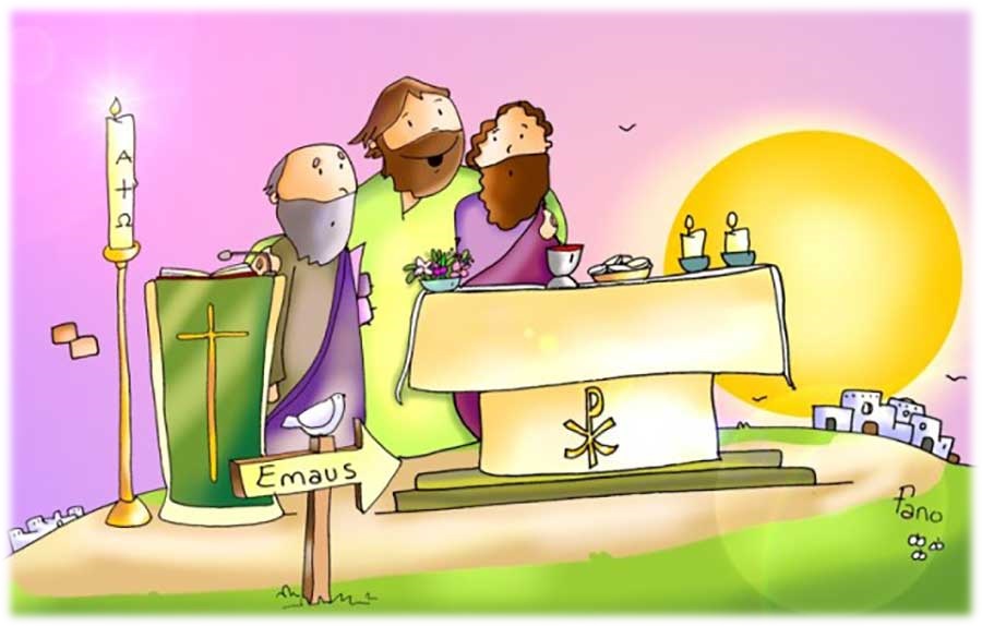 Después de resucitar Jesús, se apareció a unos discípulos que iban a una aldea que se llamaba Emaús. Los discípulos al principio no le reconocieron, y Jesús se puso a hablar con ellos y, sin que se dieran cuenta, les iba explicando lo que le había ocurrido en su pasión. Cuando llegó la hora de cenar, Jesús tomo el pan, lo bendijo y se lo dio. ¡Entonces lo reconocieron! ¡Es Jesús, es Jesús! Y volvieron a Jerusalén, para contárselo a los apóstoles.
