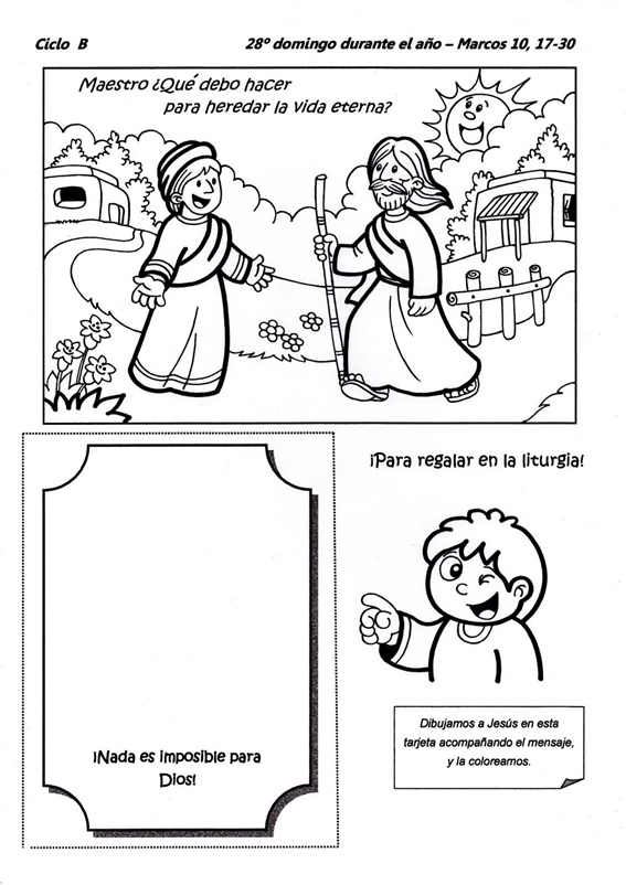 Per viure amb dignitat n’hi ha prou amb fer el bé i no el mal, és a dir, ser persones justes. Però per ser amic de Jesús, a més, cal renunciar a tot egoisme que ens porta a acumular riqueses i no compartir amb les persones que ho necessiten. Això li ho va explicar Jesús a un ric que li va preguntar què fer per ser feliç.