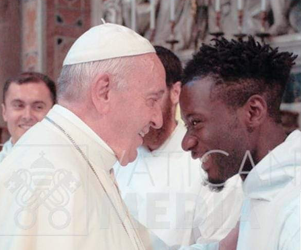 El novicio salesiano Ismael Ebenecer junto al Papa Francisco en la Basílica de San Pedro, durante la ordenación episcopal del salesiano italiano obispo auxiliar de Santiago de Chile, Alberto Lorenzelli.