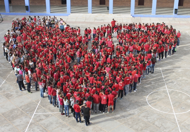 En el centro los alumnos de Infantil, arropados por los cursos superiores hasta finalizar con el contorno de los alumnos de Ciclos Formativos. Un acto con el que señalar que la solidaridad en Morón brotar del corazón.