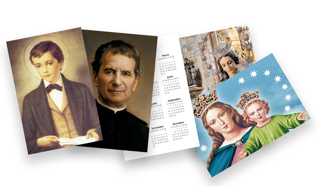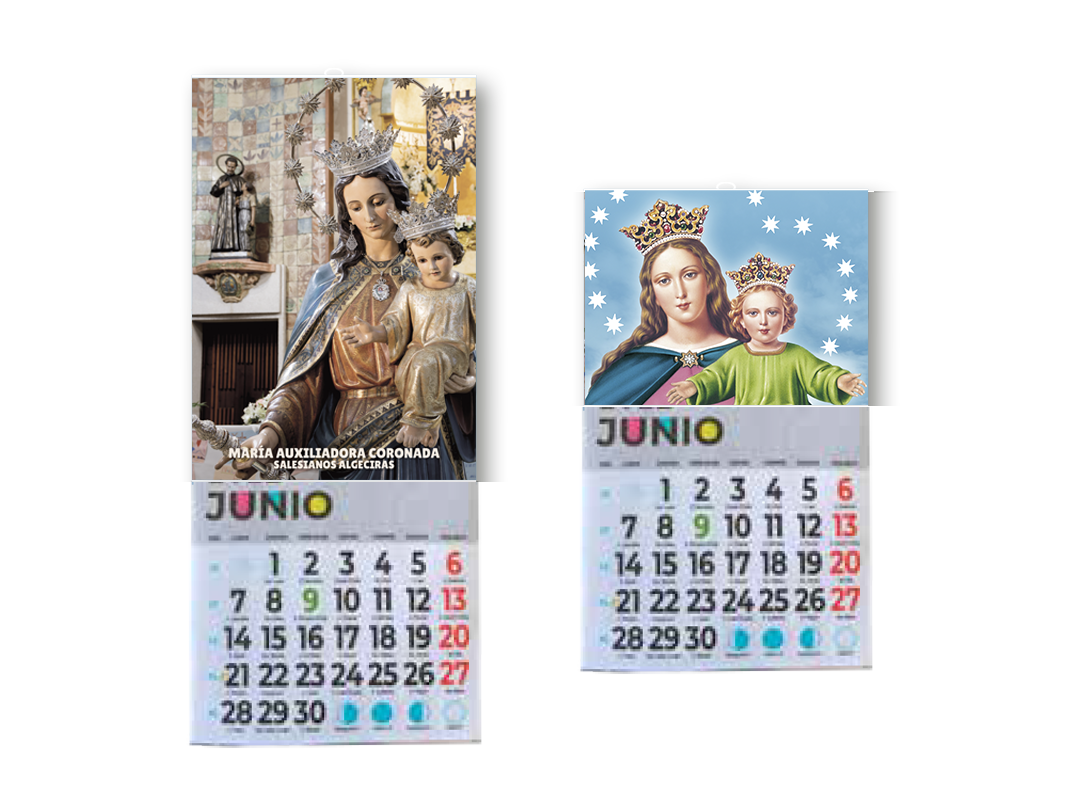 - Faldilla de 12 hojas: Compuesta por portada y los doce meses del año. Irá ilustrada con las imágenes marianas que participan en este proyecto. Cada mes aparecerán marcados y destacados los días 24. En enero también destacará el día 31 como fiesta de San Juan Bosco. Impresa a color, en papel estucado mate de gran calidad.