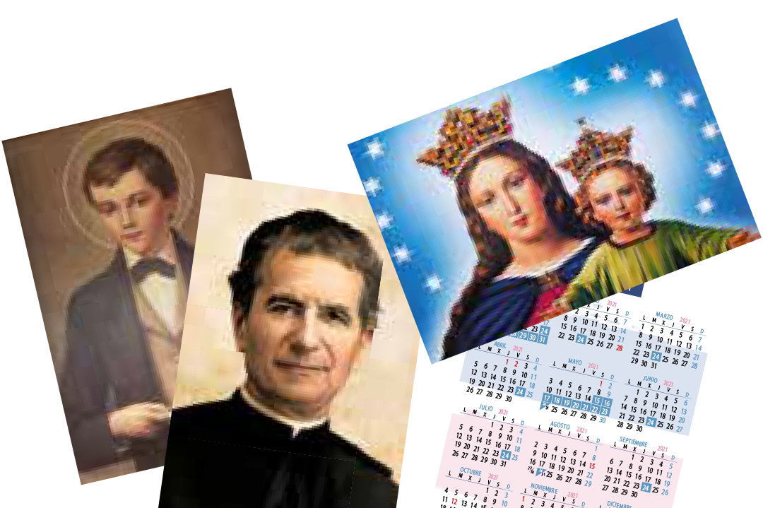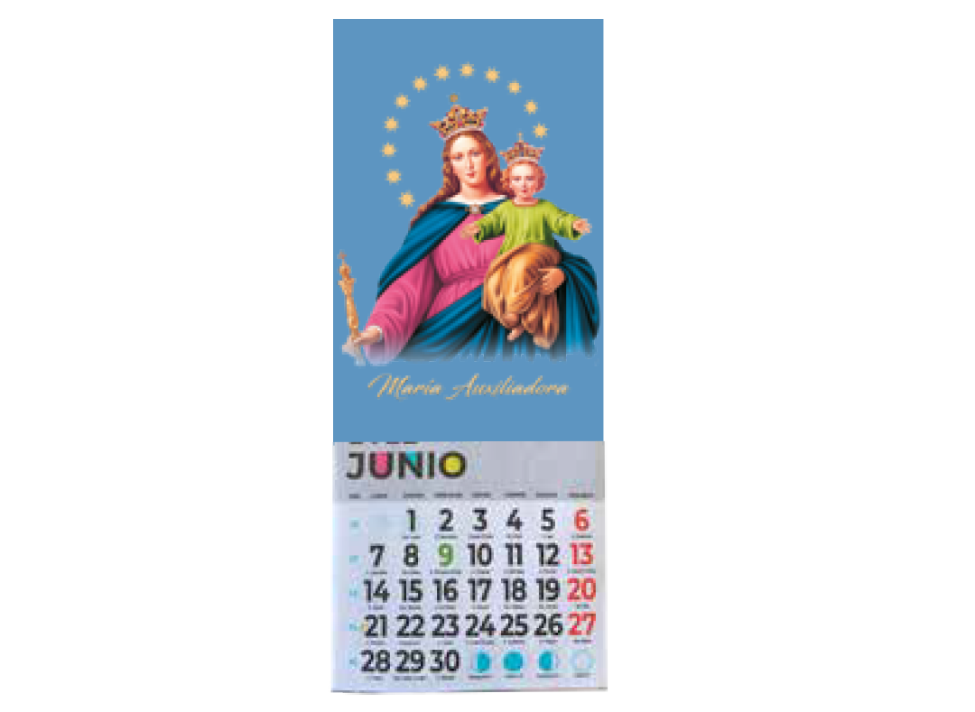 - Faldilla de 12 hojas: Compuesta por portada y los doce meses del año. Irá ilustrada con las imágenes marianas que participan en este proyecto. Cada mes aparecerán marcados y destacados los días 24. En enero también destacará el día 31 como fiesta de San Juan Bosco. Impresa a color, en papel estucado mate de gran calidad.