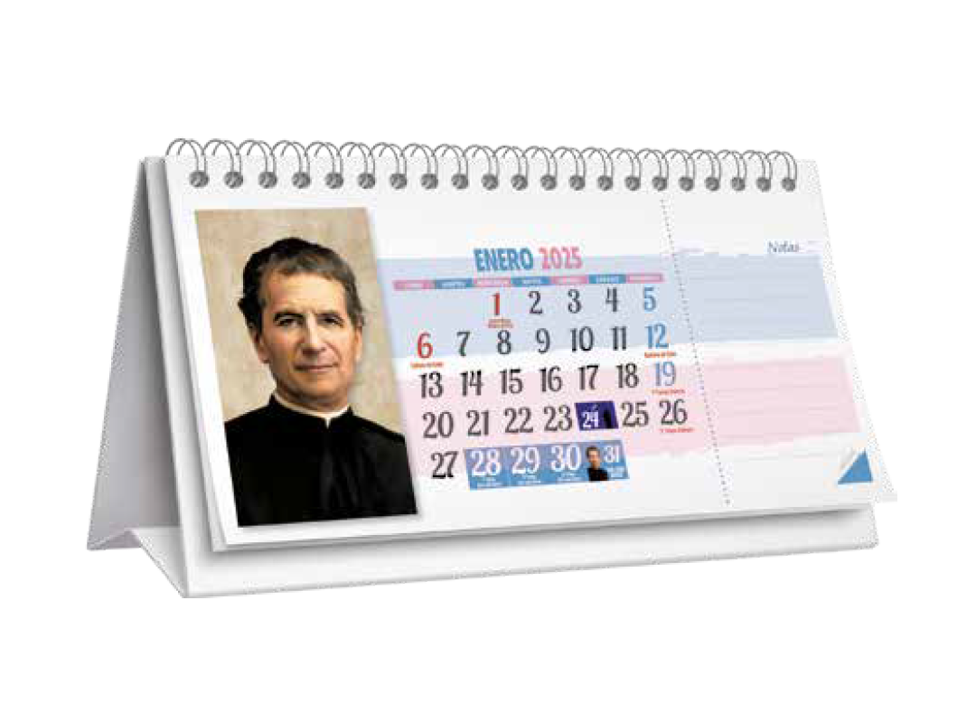 - Faldilla de 13 hojas: Compuesta por portada, 12 meses del año y la ultima página con el año 2027 completo. Cada hoja cuenta con el mes en curso más el anterior y posterior, Santoral Salesiano, ciclo lunar, cambios de horas y cambios de estaciones. Cada mes aparecerán marcados y destacados los días 24. En enero también destacará el día 31 como fiesta de San Juan Bosco. Impresa a color, en papel estucado mate de gran calidad. Se entrega envarillado y grapado.