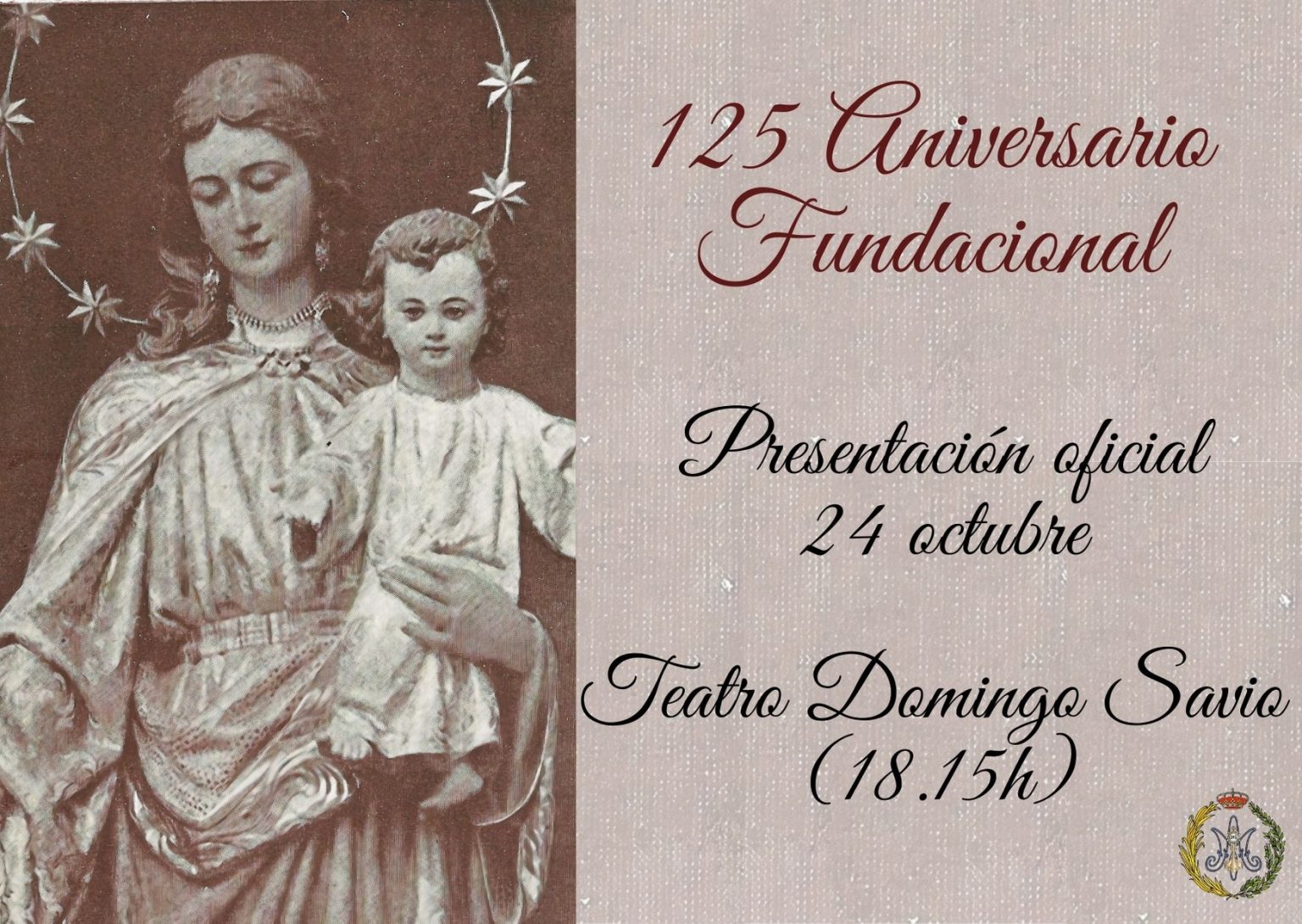 El próximo 24 de octubre, a partir de las 18:15, tendrá lugar la presentación oficial del 125 aniversario fundacional de la Archicofradía de María Auxiliadora Coronada de la casa salesiana de la Santísima Trinidad de Sevilla, que tendrá lugar en el Teatro Domingo Savio – FP (debido a las restricciones de medidas de seguridad por el COVID-19, la entrada será hasta completar el aforo de 70 personas).