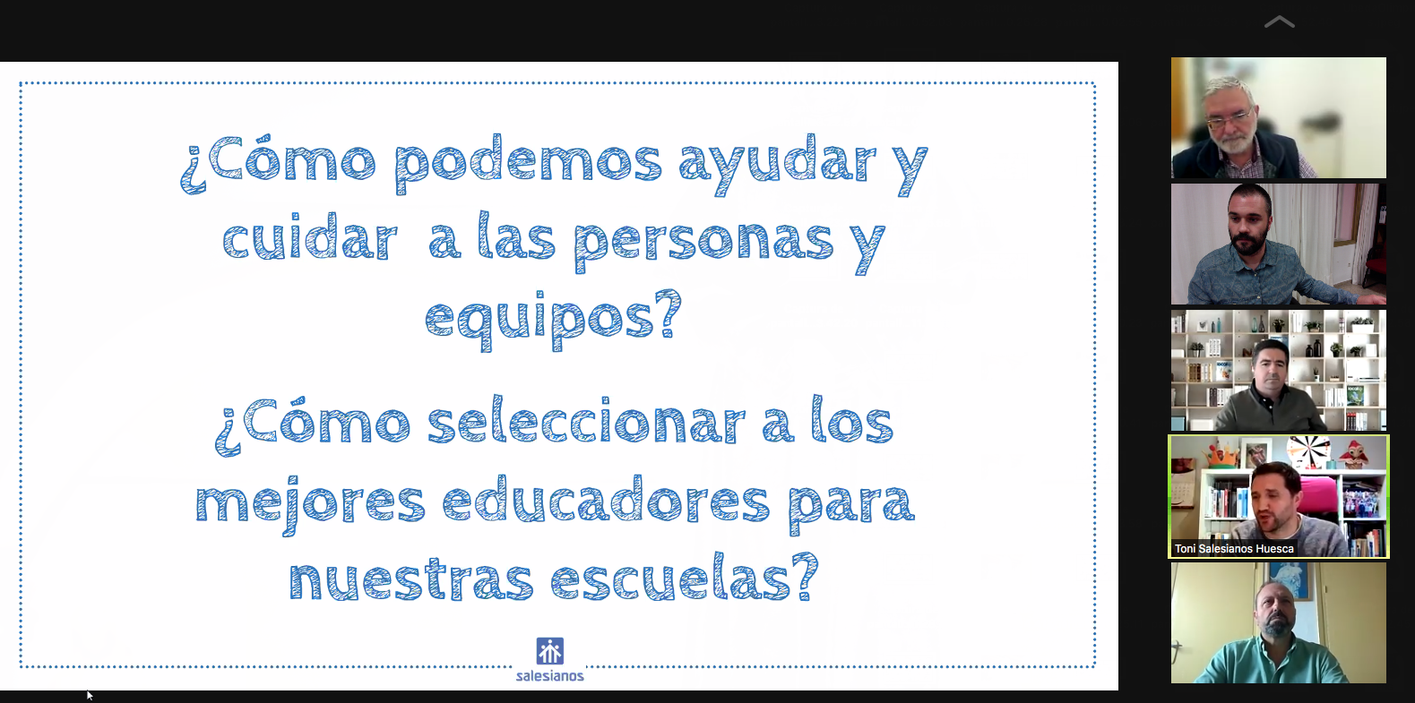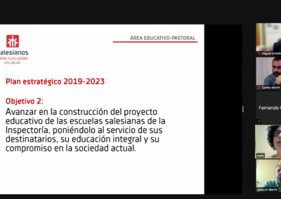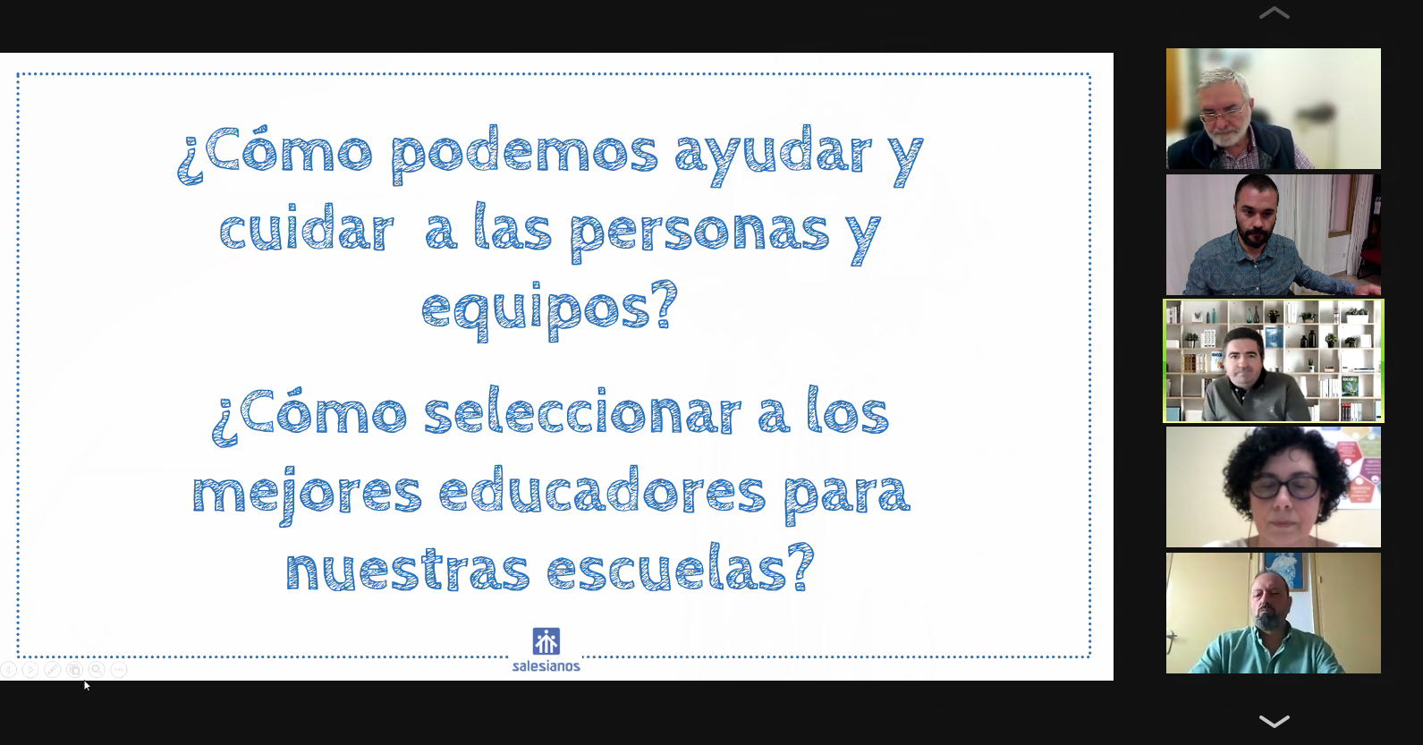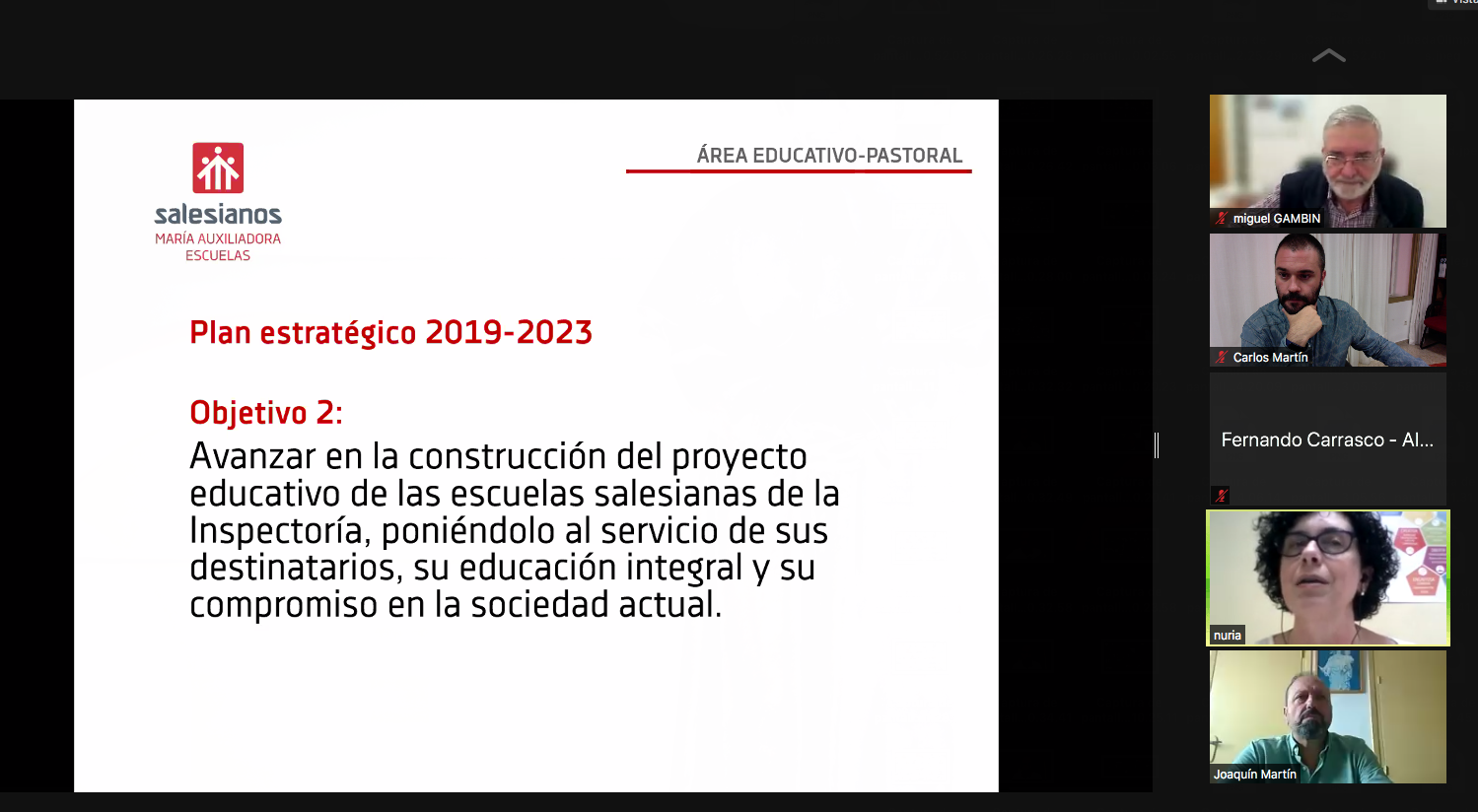 Durante la mañana del 29 de abril tuvo lugar la quinta edición del encuentro inspectorial de directores de escuelas salesianas de la Inspectoría María Auxiliadora. En esta ocasión la cita online sustituyó al tradicional encuentro en enclaves de años anteriores donde los participantes se encontraban en la Casa de Ejercicios San José de El Escorial. La distancia física no fue un inconveniente para más de un centenar de participantes de las diferentes escuelas salesianas de Andalucía, Aragón, Canarias, Cataluña, Comunidad Valenciana, Baleares, Extremadura y Región de Murcia que fueron recibidos por el mensaje de agradecimiento del inspector Ángel Asurmendi, el delegado de Pastoral Jordi Lleixà y el coordinador de Escuelas, Miguel Canino. «Gracias por vuestro esfuerzo durante todos estos meses para salir adelante con esperanza desde las escuelas salesianas», compartían como punto de partida de la sesión.
