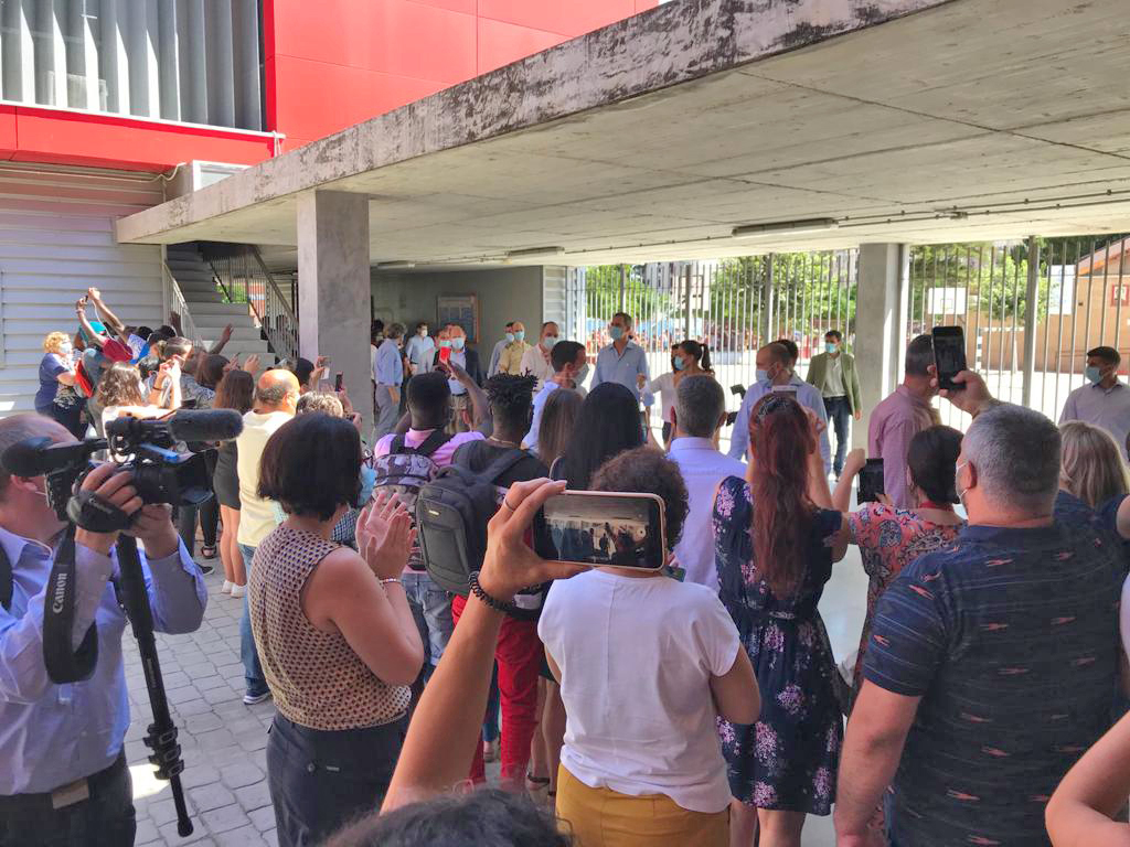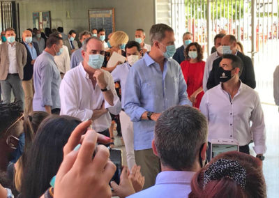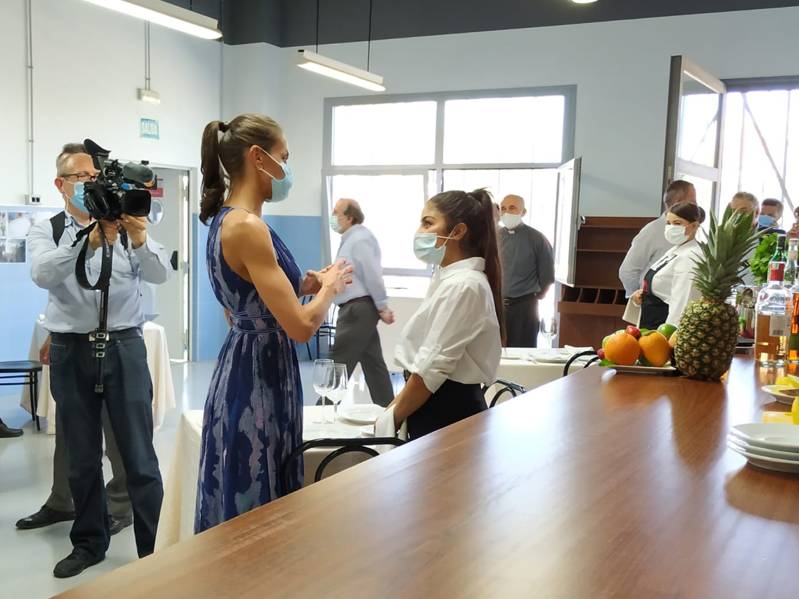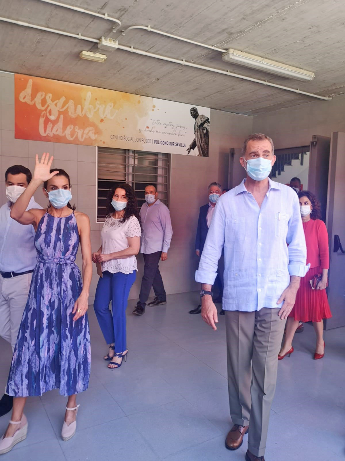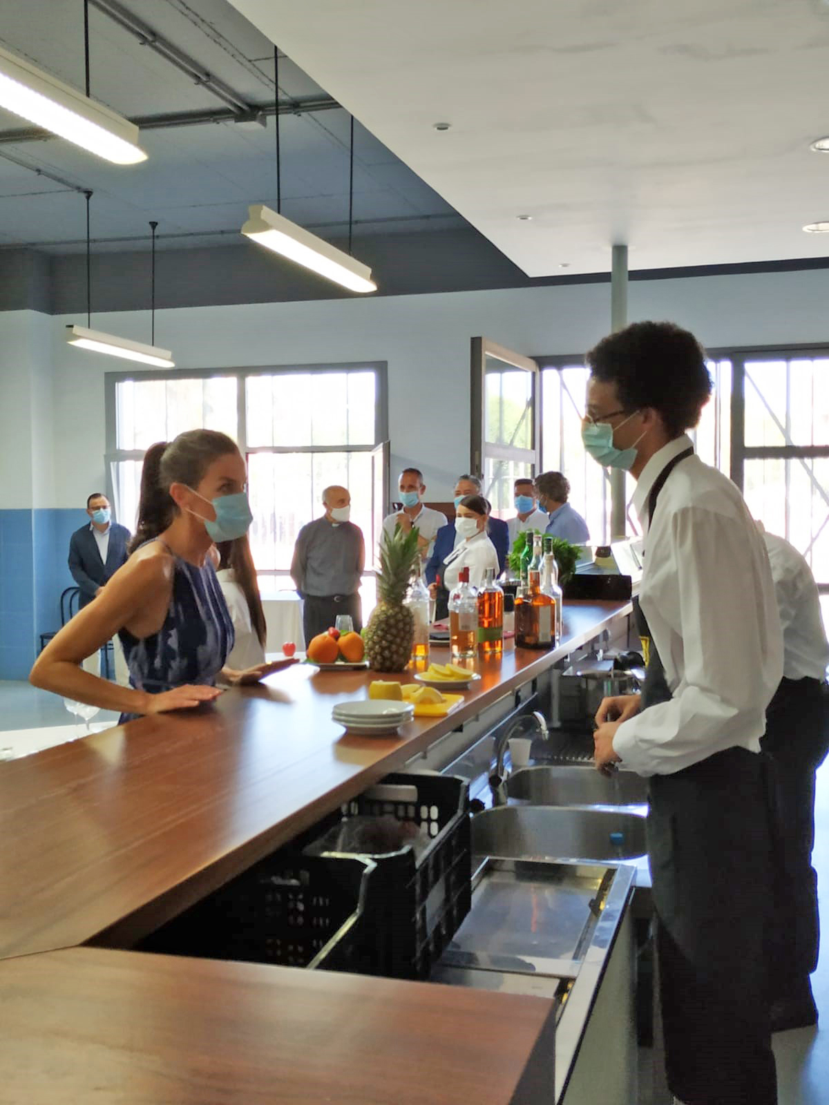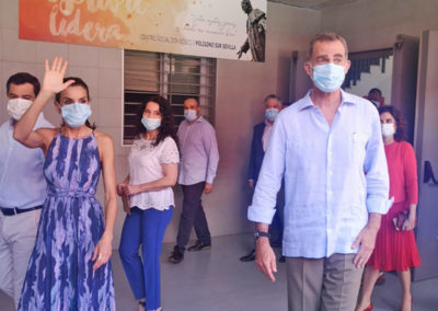 La visita concluyó con la “joya de la corona”. Occhiena, central de moda ética. Empresa social de la Fundación Don Bosco que trabaja para la incorporación de personas en situación de vulnerabilidad, especialmente mujeres, a los procesos de producción con la creación de empleo y sensibilizando a profesionales y empresas a trabajar dentro de los parámetros de la moda ética. Este momento posibilitó la entrega de unas mascarillas sanitarias personalizadas con el escudo de la Casa de su Majestad el Rey confeccionadas desde las instalaciones de la entidad. Allí estuvieron Moise y Blaise, jóvenes inmigrantes de los Pisos de Autonomía de la fundación, que desde que comenzó la pandemia realizan como voluntarios mascarillas que son repartidas entre las entidades sociales del barrio.