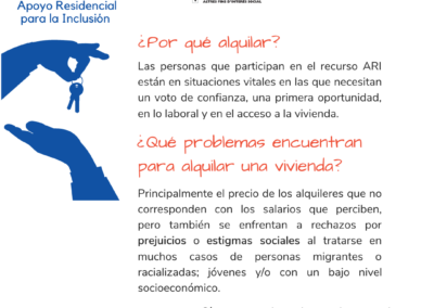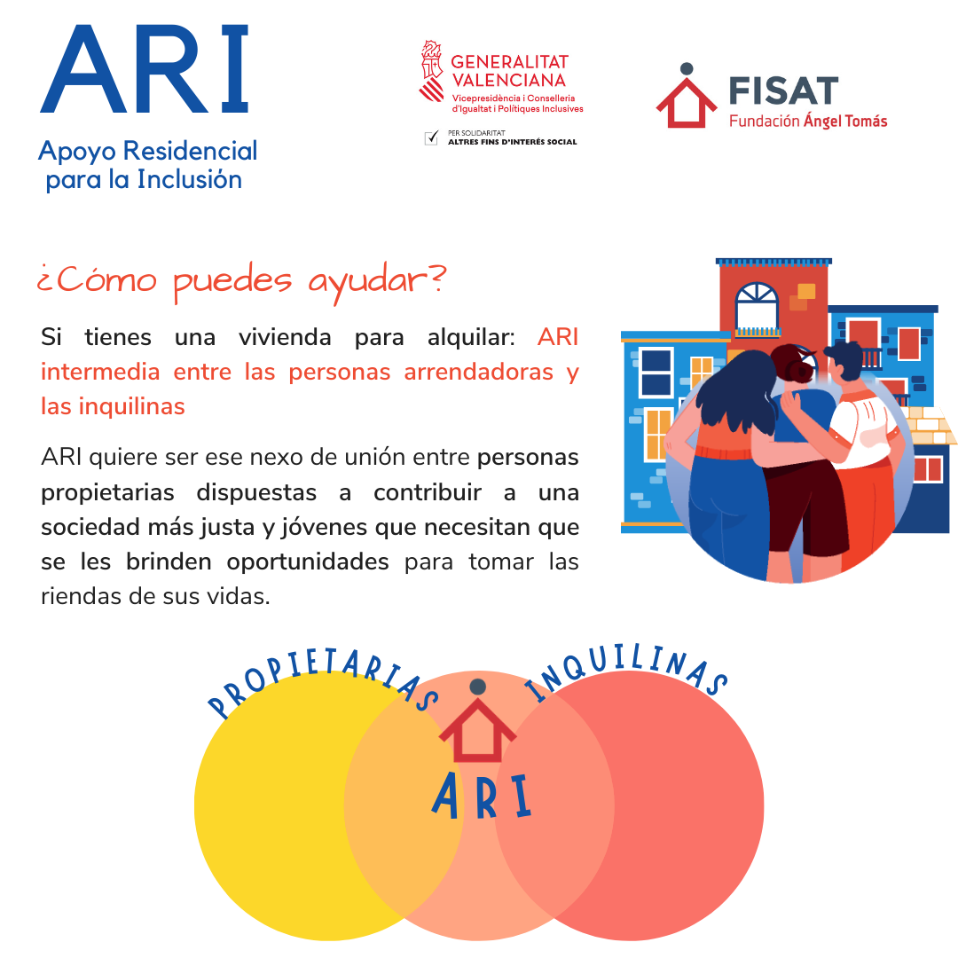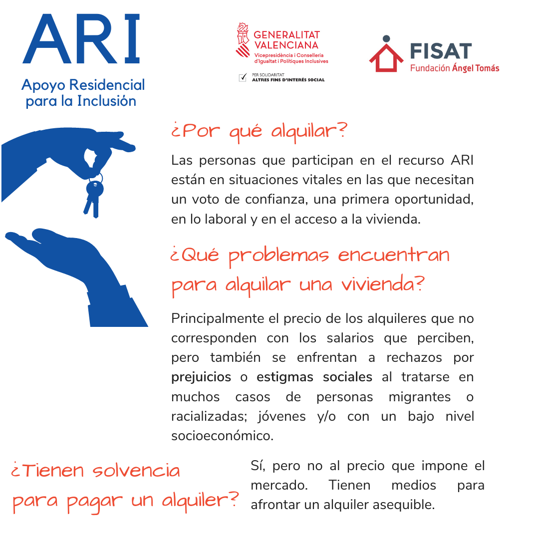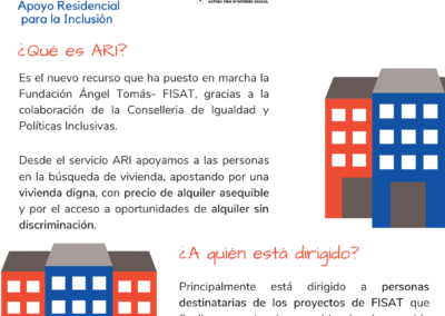 El servicio ARI trabaja en línea con los proyectos de FISAT en la Comunitat Valenciana, especialmente con los de tipología residencial y de emancipación. El objetivo es apoyar a las personas destinatarias que finalizan su estancia en estos proyectos en la búsqueda del alquiler de una vivienda.
