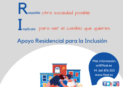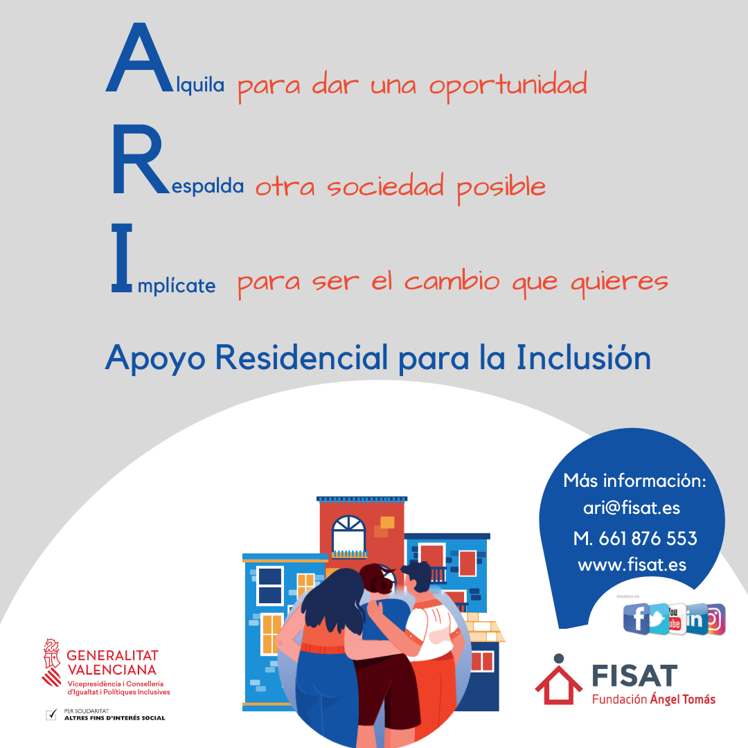 ARI: Apoyo Residencial para la Inclusión es el nuevo recurso que ha puesto en marcha la Fundación Ángel Tomás- FISAT, gracias a la colaboración de la Conselleria de Igualdad y Políticas Inclusivas, a través de la Convocatoria a cargo de la asignación tributaria del 0,7% del impuesto sobre la renta de las personas físicas (IRPF).