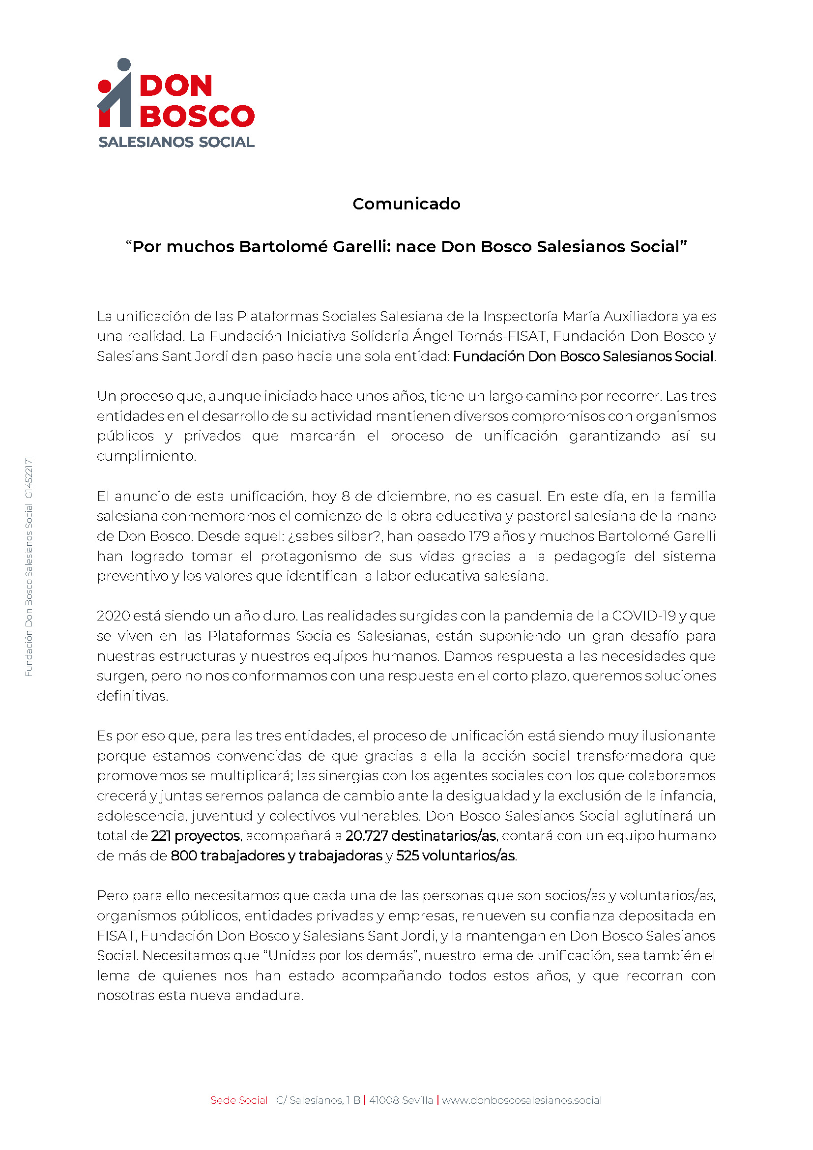 El anuncio de esta unificación, hoy 8 de diciembre, no es casual. En este día, en la familia salesiana conmemoramos el comienzo de la obra educativa y pastoral salesiana de la mano de Don Bosco. Desde aquel: ¿sabes silbar?, han pasado 179 años y muchos Bartolomé Garelli han logrado tomar el protagonismo de sus vidas gracias a la pedagogía del sistema preventivo y los valores que identifican la labor educativa salesiana.