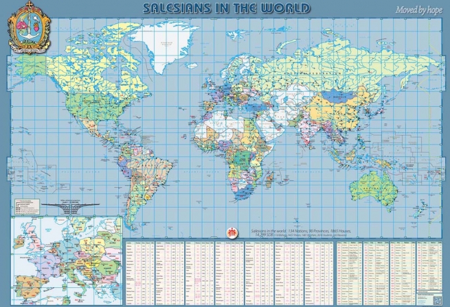 En el mapa vemos el escudo de armas de la Congregación Salesiana, que lleva la frase: Da mihi animas caetera tolle. Esta es la misión que todo salesiano lleva consigo como parte de su vida y sueño: amar a los jóvenes, caminar con ellos en la fe, educarlos para la vida, para que acepten su vocación de ser personas preparadas humana y espiritualmente para ser protagonistas de un mundo más justo, fraterno, comprometido con la vida, la ecología integral y la paz.