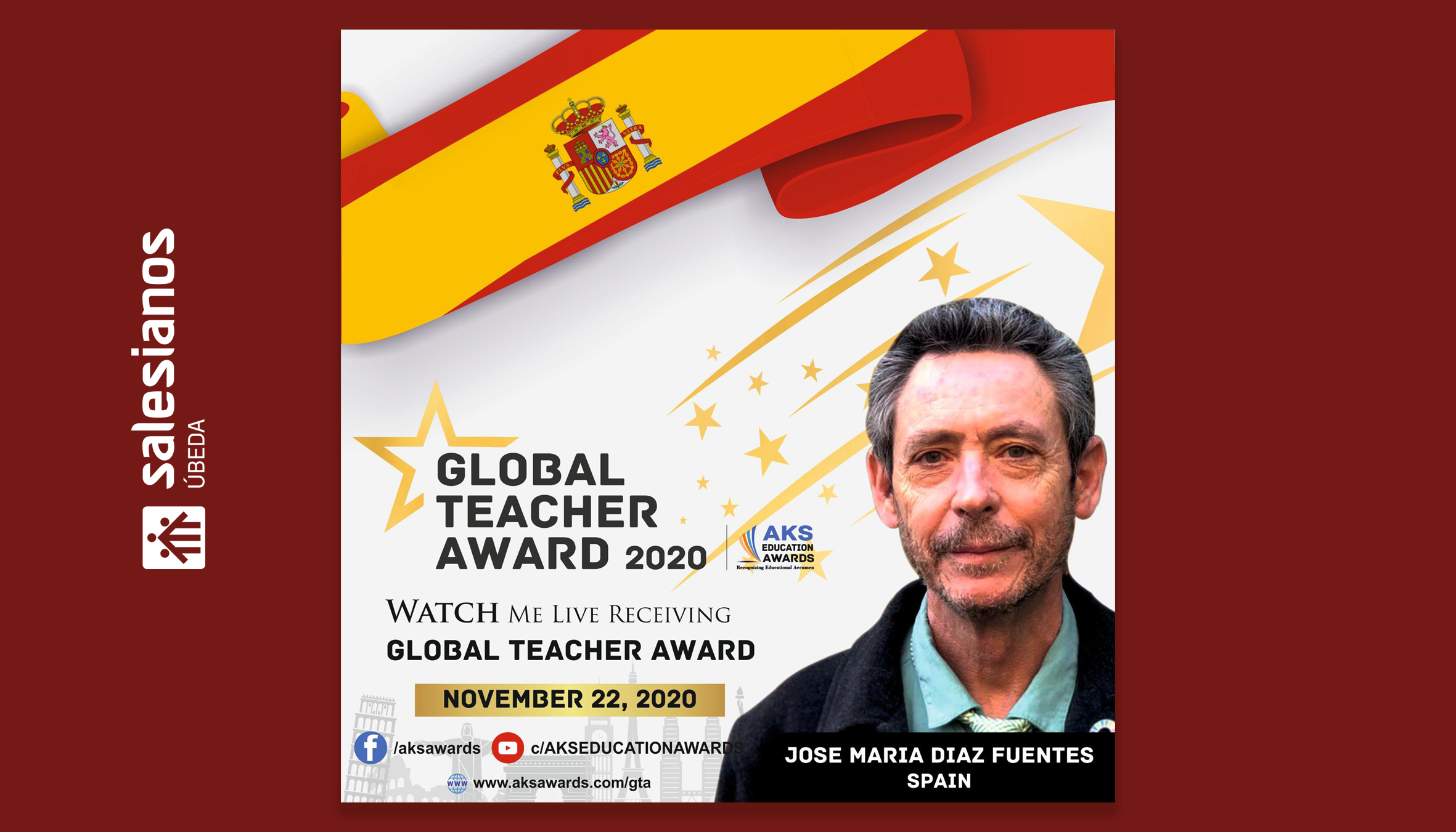 El profesor ubetense José María Díaz Fuentes ha sido galardonado en los Global Teacher Awards, prestigiosos premios internacionales que concede AKS Group a través de sus AKS Education Awards para reconocer la excelencia de profesores de todo el mundo. Es uno de los tres docentes españoles que lo han logrado en la convocatoria de este año, la tercera de estas distinciones, en la que ha participado más de un centenar de países con miles de nominaciones. Solo de España procedieron varios cientos de candidaturas.