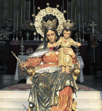En una fotografía antigua del fondo documental del Centro Histórico Salesiano de Carabanchel, aparece esta bella imagen de María Auxiliadora, de la casa salesiana de Triana, en Sevilla. Llama mucho la atención su iconografía. Está sentada en un trono y no de pie como estamos acostumbrados. También la expresión de la cara de la Virgen y del Niño morena y expresión andaluza. El Niño, en este caso, está de pie sobre la pierna izquierda de la imagen de la Virgen. De dicha foto no tenemos documentación alguna, no aparece ni siquiera alguna fecha que lo indique.