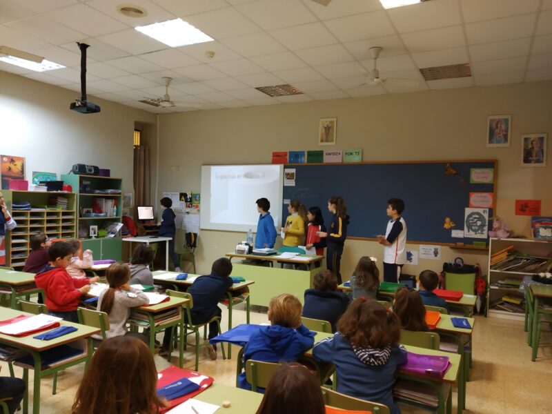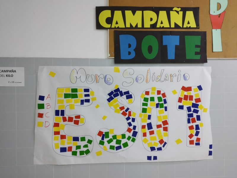 Hacemos una campaña de unas tres semanas de duración. Los alumnos de Infantil, Primaria, FBO y PTVAL se encargan de traer una serie de productos que se les asignan. Cada clase tiene la imagen de un saco que se va llenando de caritas felices a medida que traen alimentos bajo el lema: “Comparte y sonríe”. La clase que más caritas consiga será la ganadora y el día de la eucaristía de Navidad se le hará entrega de un diploma a la clase más solidaria. Los alumnos de 3º ESO en el Proyecto de Aprendizaje y Servicio han puesto en marcha una iniciativa de recogida de leche que ya se realizó hace un par de años y titulan “El club de la buena leche” que motiva el profesor Juanfran Medina.