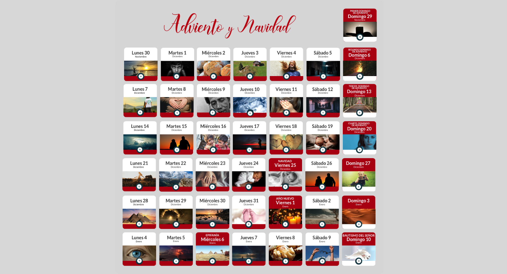 Cada día del calendario incluye el Evangelio del día y un comentario sobre el mismo a cargo del salesiano José J. Gómez. También se puede acceder a sugerencias para las homilías de estos días, tanto para la Misa ordinaria como para la Misa con niños. Otro recurso es el de ‘Comunidades en oración’, confeccionado para profundizar en la reflexión durante la semana. La propuesta diaria se completa con una frase destacada, un vídeo o una canción con valores y materiales para las celebraciones en los colegios.
