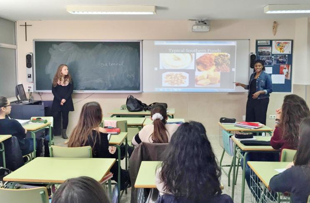 Kayla y Elise están participando en las clases de Primaria y también han realizado dos sesiones en 2º Bachillerato. Para estos últimos, prepararon una presentación sobre sus lugares de nacimiento en los Estados Unidos y contestaron a las preguntas que les iban formulando.