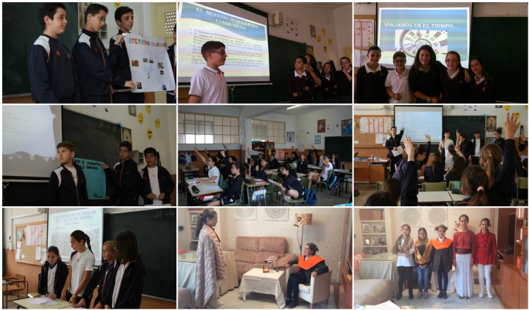 Los alumnos han investigado, “curado” contenidos, preparado una presentación y evaluado a diario sus progresos. Esta actividad ha sido llamada El Ministerio del Tiempo, aprovechando el impulso de la magnífica serie de TVE. Gracias a su creatividad los alumnos han aprendido con un Pasapalabra sobre la industrialización en España, han entrevistado (¡en directo!) al mismísimo Alfonso XII y representado la escena en que las tropas francesas invaden España.